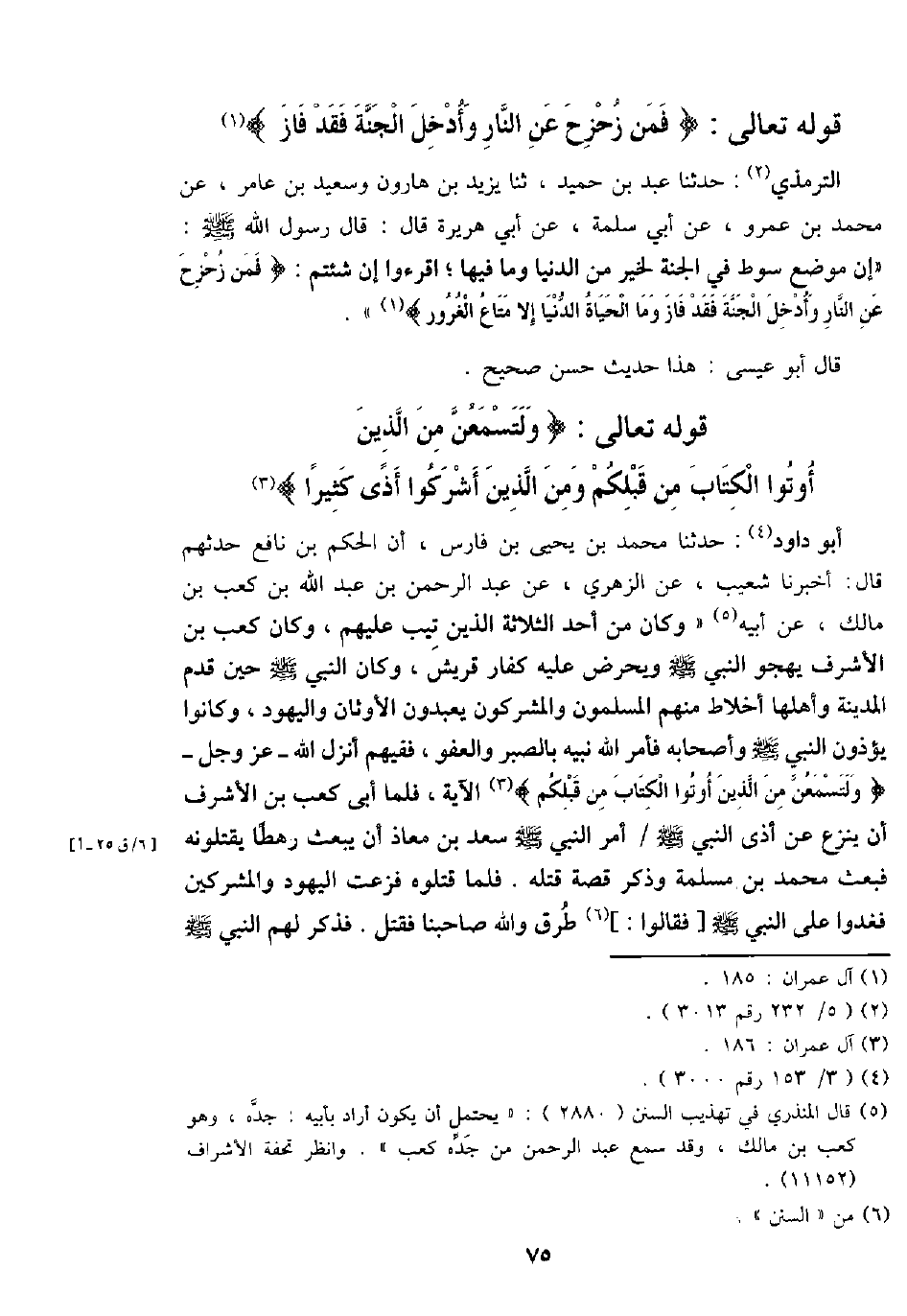 أَبُو دَاوُد: حَدثنَا مُحَمَّد بن يحيى بن فَارس، أَن الحكم بن نَافِع حَدثهمْ قَالَ: أخبرنَا شُعَيْب، عَن الزُّهْرِيّ، عَن عبد الرَّحْمَن بن عبد الله بن كَعْب بن مَالك، عَن أَبِيه " وَكَانَ من أحد الثَّلَاثَة الَّذين تيب عَلَيْهِم، وَكَانَ كَعْب بن الْأَشْرَف يهجو النَّبِي - صَلَّى اللَّهُ عَلَيْهِ وَسَلَّم َ - ويحرض عَلَيْهِ كفار قُرَيْش، وَكَانَ النَّبِي - صَلَّى اللَّهُ عَلَيْهِ وَسَلَّم َ - حِين قدم الْمَدِينَة وَأَهْلهَا أخلاط مِنْهُم الْمُسلمُونَ وَالْمُشْرِكُونَ يعْبدُونَ الْأَوْثَان وَالْيَهُود، وَكَانُوا يُؤْذونَ النَّبِي - صَلَّى اللَّهُ عَلَيْهِ وَسَلَّم َ - وَأَصْحَابه فَأمر الله نبيه بِالصبرِ وَالْعَفو، ففيهم أنزل الله - عز وَجل - {ولتسمعن من الَّذين أُوتُوا الْكتاب من قبلكُمْ} الْآيَة، فَلَمَّا أَبى كَعْب بن الْأَشْرَف أَن ينْزع عَن أَذَى النَّبِي - صَلَّى اللَّهُ عَلَيْهِ وَسَلَّم َ - / أَمر النَّبِي - صَلَّى اللَّهُ عَلَيْهِ وَسَلَّم َ - سعد بن معَاذ أَن يبْعَث رهطا يقتلونه فَبعث مُحَمَّد بن مسلمة وَذكر قصَّة قَتله. فَلَمَّا قَتَلُوهُ فزعت الْيَهُود وَالْمُشْرِكين فَغَدوْا على النَّبِي - صَلَّى اللَّهُ عَلَيْهِ وَسَلَّم َ -[فَقَالُوا:] طرق وَالله صاحبنا فَقتل. فَذكر لَهُم النَّبِي - صَلَّى اللَّهُ عَلَيْهِ وَسَلَّم َ -