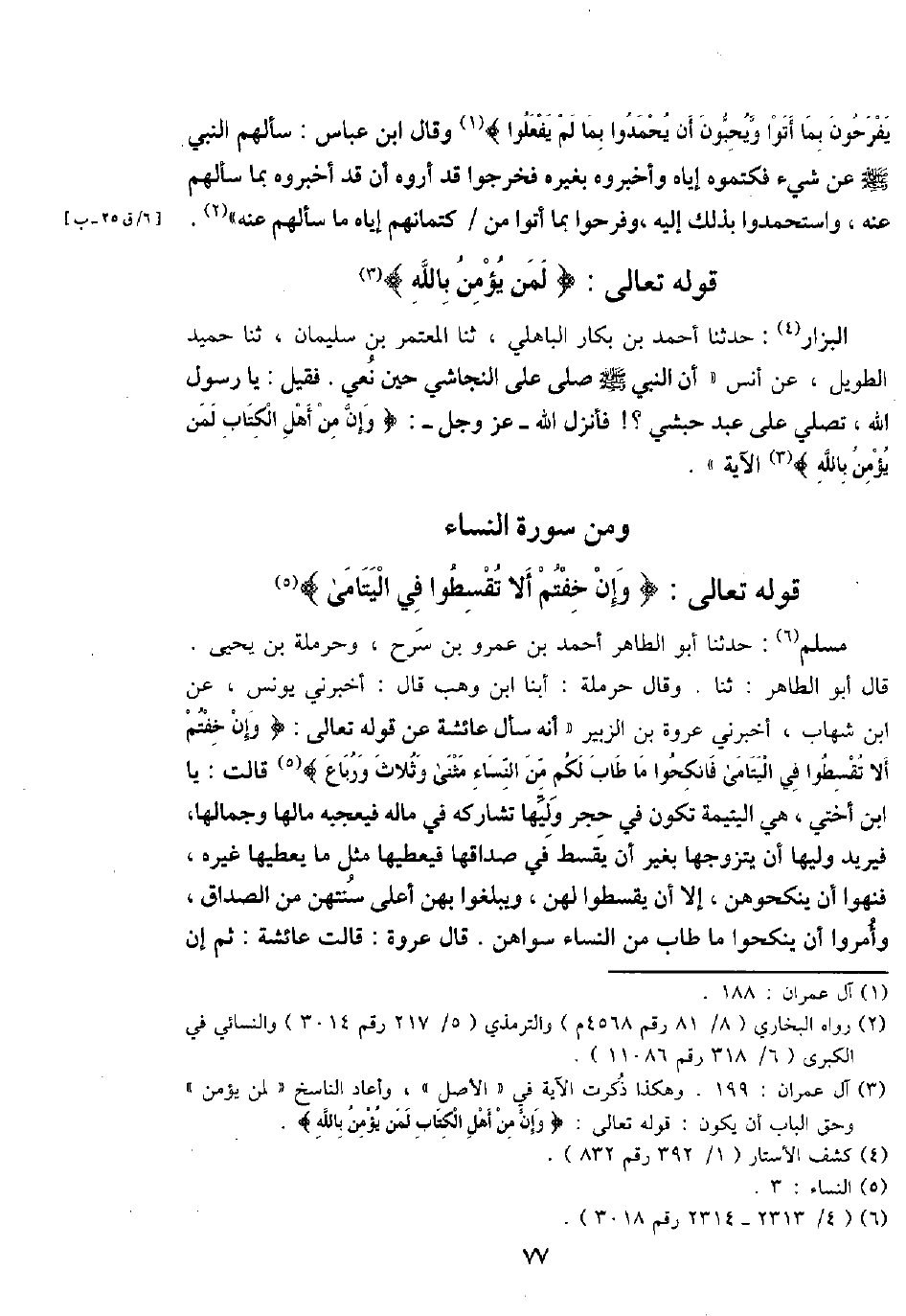 الْبَزَّار: حَدثنَا أَحْمد بن بكار الْبَاهِلِيّ، ثَنَا الْمُعْتَمِر بن سُلَيْمَان، ثَنَا حميد الطَّوِيل، عَن أنس " أَن النَّبِي - صَلَّى اللَّهُ عَلَيْهِ وَسَلَّم َ - صلى على النَّجَاشِيّ حِين نعي. فَقيل: يَا رَسُول الله، تصلي على عبد حبشِي؟ ! فَأنْزل الله - عز وَجل -: {وَإِن من أهل الْكتاب لمن يُؤمن بِاللَّه} الْآيَة ".