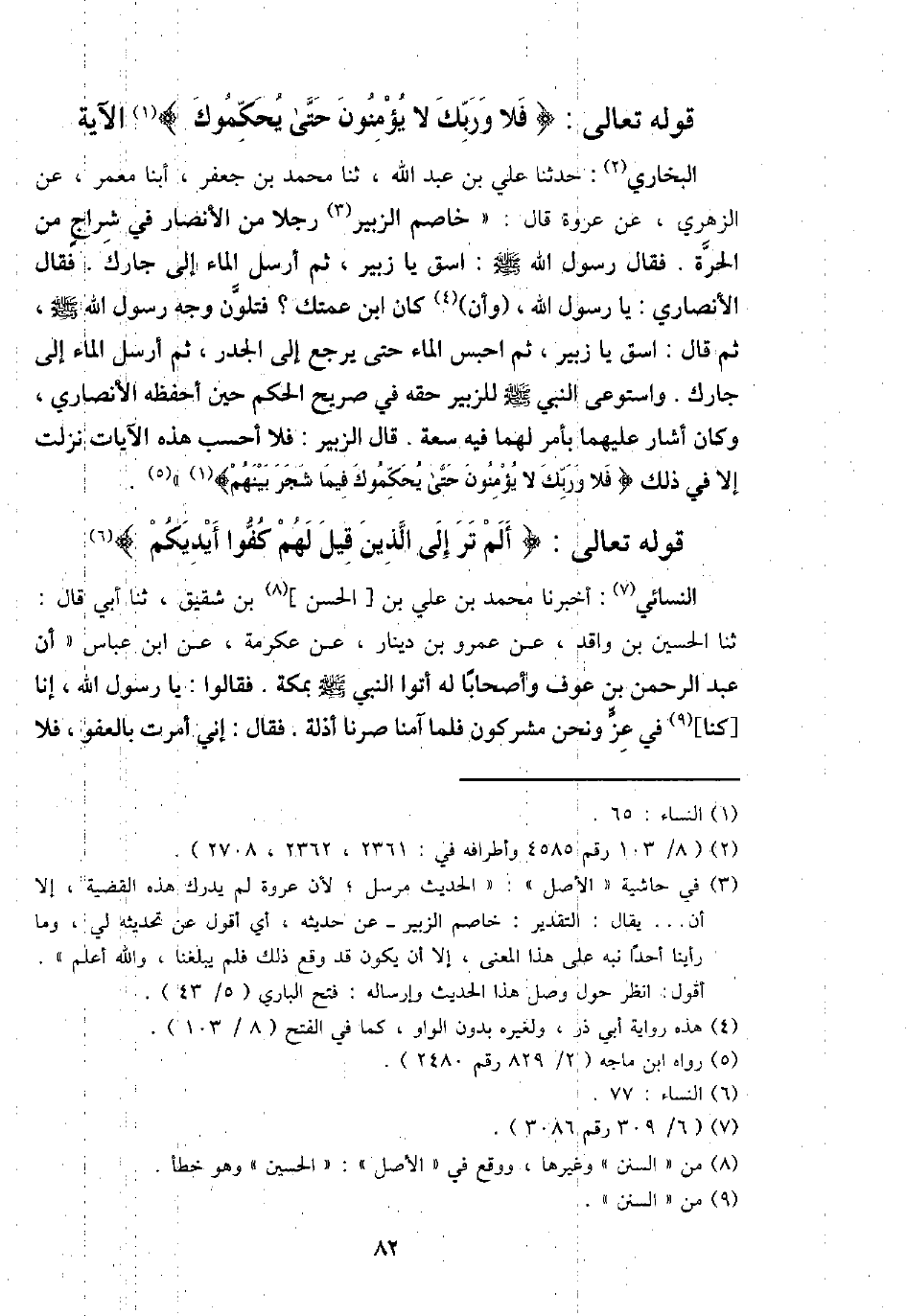 البُخَارِيّ: حَدثنَا عَليّ بن عبد الله، ثَنَا مُحَمَّد بن جَعْفَر، أبنا معمر، عَن الزُّهْرِيّ، عَن عُرْوَة قَالَ: " خَاصم الزبير، رجلا من الْأَنْصَار فِي شراج من الْحرَّة. فَقَالَ رَسُول الله - صَلَّى اللَّهُ عَلَيْهِ وَسَلَّم َ -: اسْقِ يَا زبير، ثمَّ أرسل المَاء إِلَى جَارك. فَقَالَ الْأنْصَارِيّ: يَا رَسُول الله، (وَأَن) كَانَ ابْن عَمَّتك؟ فَتَلَوَّنَ وَجه رَسُول الله - صَلَّى اللَّهُ عَلَيْهِ وَسَلَّم َ -، ثمَّ قَالَ: اسْقِ يَا زبير، ثمَّ احْبِسْ المَاء حَتَّى يرجع إِلَى الْجدر، ثمَّ أرسل المَاء إِلَى جَارك. واستوعى النَّبِي - صَلَّى اللَّهُ عَلَيْهِ وَسَلَّم َ - للزبير حَقه فِي صَرِيح الحكم حِين أحفظه الْأنْصَارِيّ، وَكَانَ أَشَارَ عَلَيْهِمَا بِأَمْر لَهما فِيهِ سَعَة. قَالَ الزبير: فَلَا أَحسب هَذِه الْآيَات نزلت إِلَّا فِي ذَلِك {فَلَا وَرَبك لَا يُؤمنُونَ حَتَّى يُحَكِّمُوك فِيمَا شجر بَينهم} ".