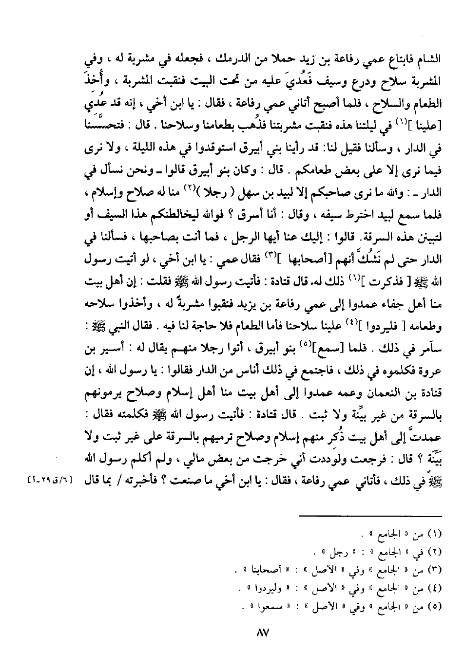 الشَّام فَابْتَاعَ عمي رِفَاعَة بن زيد حملا من الدَّرْمَك، فَجعله فِي مشربَة لَهُ، وَفِي الْمشْربَة سلَاح وَدرع وَسيف فعدي عَلَيْهِ من تَحت الْبَيْت فنقبت الْمشْربَة، وَأخذ الطَّعَام وَالسِّلَاح، فَلَمَّا أصبح أَتَانِي عمي رِفَاعَة، فَقَالَ: يَا ابْن أخي، إِنَّه قد عدي [علينا] فِي ليلتنا هَذِه فنقبت مشربتنا فَذهب بِطَعَامِنَا وَسِلَاحنَا. قَالَ: فتحسسنا فِي الدَّار، وَسَأَلنَا فَقيل لنا: قد رَأينَا بني أُبَيْرِق اسْتَوْقَدُوا فِي هَذِه اللَّيْلَة، وَلَا نرى فِيمَا نرى إِلَّا على بعض طَعَامكُمْ. قَالَ: وَكَانَ بَنو أُبَيْرِق قَالُوا - وَنحن نسْأَل فِي الدَّار -: وَالله مَا نرى صَاحبكُم إِلَّا لبيد بن سهل (رجلا) منا لَهُ صَلَاح وَإِسْلَام، فَلَمَّا سمع لبيد اخْتَرَطَ سَيْفه، وَقَالَ: أَنا أسرق؟ فوَاللَّه لَيُخَالِطَنكُمْ هَذَا السَّيْف أَو لتبينن هَذِه السّرقَة. قَالُوا: إِلَيْك عَنَّا أَيهَا الرجل، فَمَا أَنْت بصاحبها، فسألنا فِي الدَّار حَتَّى لم نشك أَنهم [أَصْحَابنَا] فَقَالَ عمي: يَا ابْن أخي، لَو أتيت رَسُول الله - صَلَّى اللَّهُ عَلَيْهِ وَسَلَّم َ -[فَذكرت] ذَلِك لَهُ. قَالَ قَتَادَة: فَأتيت رَسُول الله - صَلَّى اللَّهُ عَلَيْهِ وَسَلَّم َ - فَقلت: إِن أهل بَيت منا أهل جفَاء عَمدُوا إِلَى عمي رِفَاعَة بن يزِيد فَنقبُوا مشربَة لَهُ، وَأخذُوا سلاحه وَطَعَامه [فليردوا] علينا سِلَاحنَا فَأَما الطَّعَام فَلَا حَاجَة لنا فِيهِ. فَقَالَ النَّبِي - صَلَّى اللَّهُ عَلَيْهِ وَسَلَّم َ -: سآمر فِي ذَلِك. فَلَمَّا [سمع] بَنو أُبَيْرِق، أَتَوْ رجلا مِنْهُم يُقَال لَهُ: أَسِير بن عُرْوَة فكلموه فِي ذَلِك، فَاجْتمع فِي ذَلِك أنَاس من الدَّار فَقَالُوا: يَا رَسُول الله، إِن قَتَادَة بن النُّعْمَان وَعَمه عَمدُوا إِلَى أهل بَيت منا أهل إِسْلَام وَصَلَاح يرمونهم بِالسَّرقَةِ من غير بَيِّنَة وَلَا ثَبت. قَالَ قَتَادَة: فَأتيت رَسُول الله - صَلَّى اللَّهُ عَلَيْهِ وَسَلَّم َ - فكلمته فَقَالَ: عَمَدت إِلَى أهل بَيت ذكر مِنْهُم إِسْلَام وَصَلَاح ترميهم بِالسَّرقَةِ على غير ثَبت وَلَا بَيِّنَة؟ قَالَ: فَرَجَعت ولوددت أَنِّي خرجت من بعض مَالِي، وَلم أكلم رَسُول الله - صَلَّى اللَّهُ عَلَيْهِ وَسَلَّم َ - فِي ذَلِك، فَأَتَانِي عمي رِفَاعَة، فَقَالَ: يَا ابْن أخي مَا صنعت؟ فَأَخْبَرته / بِمَا قَالَ