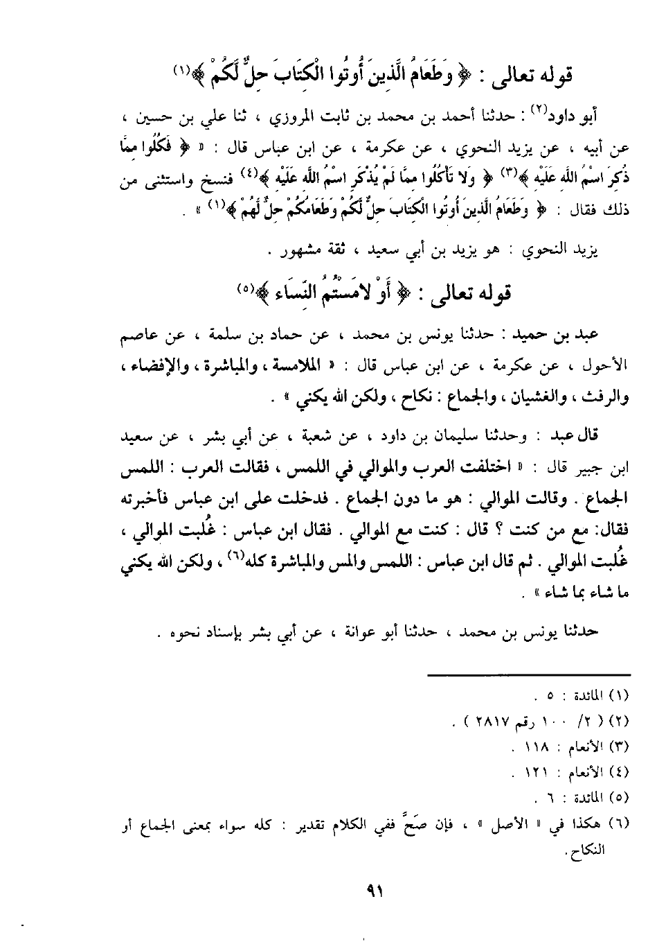 أَبُو دَاوُد: حَدثنَا أَحْمد بن مُحَمَّد بن ثَابت الْمروزِي، ثَنَا عَليّ بن حُسَيْن، عَن أَبِيه، عَن يزِيد النَّحْوِيّ، عَن عِكْرِمَة، عَن ابْن عَبَّاس قَالَ: " {فَكُلُوا مِمَّا ذكر اسْم الله عَلَيْهِ} {وَلَا تَأْكُلُوا مِمَّا لم يذكر اسْم الله عَلَيْهِ} فنسخ وَاسْتثنى من ذَلِك فَقَالَ: {وَطَعَام الَّذين أُوتُوا الْكتاب حل لكم وطعامكم حل لَهُم} ".