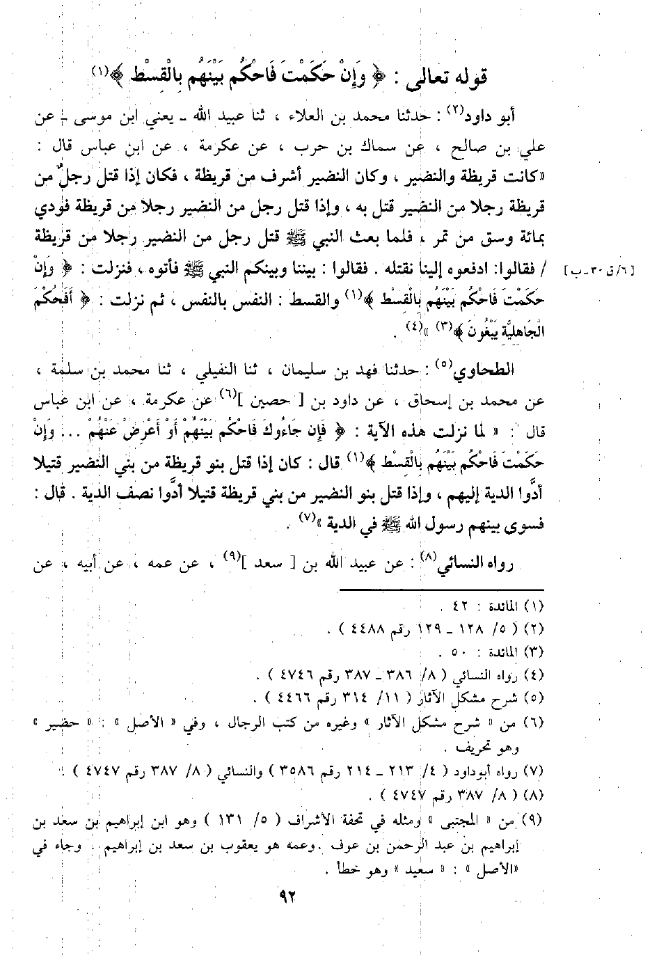 الطَّحَاوِيّ: حَدثنَا فَهد بن سُلَيْمَان، ثَنَا النُّفَيْلِي، ثَنَا مُحَمَّد بن سَلمَة، عَن مُحَمَّد بن إِسْحَاق، عَن دَاوُد بن [حُصَيْن] عَن عِكْرِمَة، عَن ابْن عَبَّاس قَالَ: " لما نزلت هَذِه الْآيَة: {فَإِن جاءوك فاحكم بَينهم أَو أعرض عَنْهُم ... وَإِن حكمت فاحكم بَينهم بِالْقِسْطِ} قَالَ: كَانَ إِذا قتل بَنو قُرَيْظَة من بَين النَّضِير قَتِيلا أَدّوا الدِّيَة إِلَيْهِم، وَإِذا قتل بَنو النَّضِير من بني قُرَيْظَة قَتِيلا أَدّوا نصف الدِّيَة. قَالَ: فسوى بَينهم رَسُول الله - صَلَّى اللَّهُ عَلَيْهِ وَسَلَّم َ - فِي الدِّيَة ".