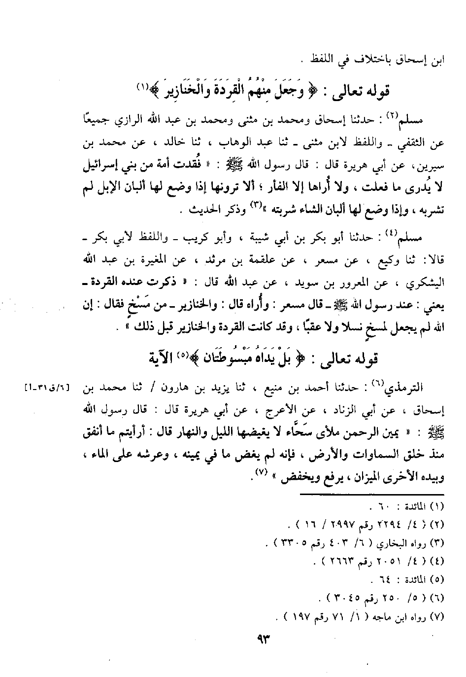 مُسلم: حَدثنَا أَبُو بكر بن أبي شيبَة، وَأَبُو كريب - وَاللَّفْظ لأبي بكر - قَالَا: ثَنَا وَكِيع، عَن مسعر، عَن عَلْقَمَة بن مرْثَد، عَن الْمُغيرَة بن عبد الله الْيَشْكُرِي، عَن الْمَعْرُور بن سُوَيْد، عَن عبد الله قَالَ: " ذكرت عِنْده القردة - يَعْنِي: عِنْد رَسُول الله - صَلَّى اللَّهُ عَلَيْهِ وَسَلَّم َ - قَالَ مسعر: وَأرَاهُ قَالَ: والخنازير - من مسخ فَقَالَ: إِن الله لم يَجْعَل لمسخ نَسْلًا وَلَا عقبا، وَقد كَانَت القردة والخنازير قبل ذَلِك ".