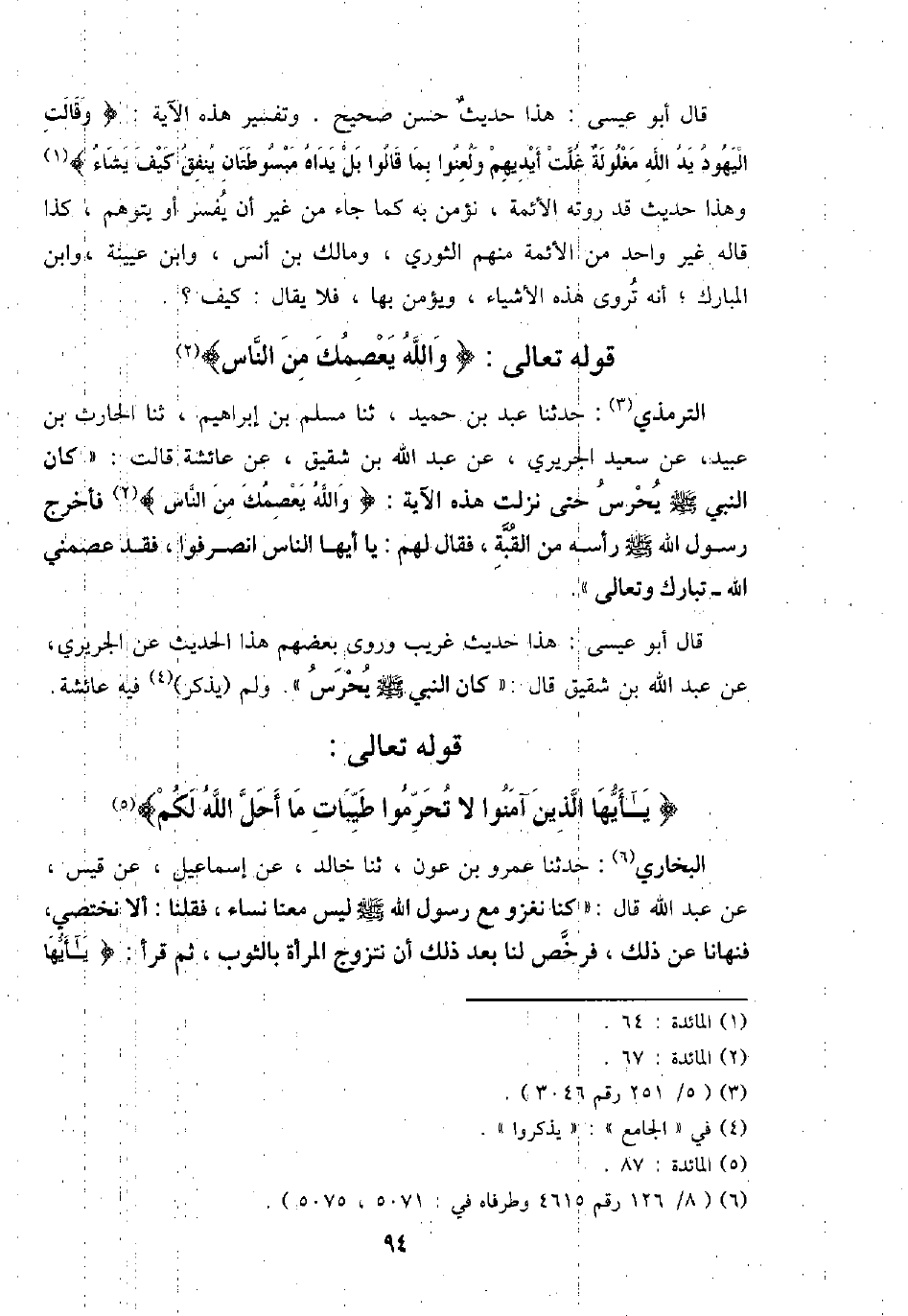 التِّرْمِذِيّ: حَدثنَا عبد بن حميد، ثَنَا مُسلم بن إِبْرَاهِيم، ثَنَا الْحَارِث بن عبيد، عَن سعيد الْجريرِي، عَن عبد الله بن شَقِيق، عَن عَائِشَة قَالَت: " كَانَ النَّبِي - صَلَّى اللَّهُ عَلَيْهِ وَسَلَّم َ - يحرس حَتَّى نزلت هَذِه الْآيَة: {وَالله يَعْصِمك من النَّاس} فَأخْرج رَسُول الله - صَلَّى اللَّهُ عَلَيْهِ وَسَلَّم َ - رَأسه من الْقبَّة، فَقَالَ لَهُم: يَا أَيهَا النَّاس انصرفوا، فقد عصمني الله - تبَارك وَتَعَالَى ".