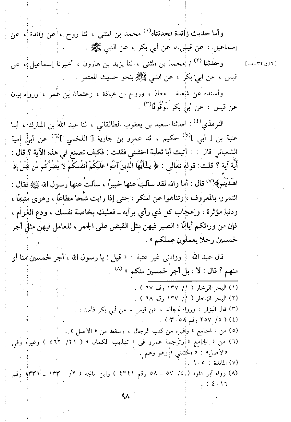 التِّرْمِذِيّ: حَدثنَا سعيد بن يَعْقُوب الطَّالقَانِي، ثَنَا عبد الله بن الْمُبَارك، أبنا عتبَة بن [أبي] حَكِيم، ثَنَا عَمْرو بن جَارِيَة [اللَّخْمِيّ] عَن أبي أُميَّة الشَّعْبَانِي قَالَ: " أتيت أَبَا ثَعْلَبَة الْخُشَنِي فَقلت: فَكيف تصنع فِي هَذِه الْآيَة؟ قَالَ: أَيَّة آيَة؟ قلت: قَوْله تَعَالَى: {يَا أَيهَا الَّذين آمنُوا عَلَيْكُم أَنفسكُم لَا يضركم من ضل إِذا اهْتَدَيْتُمْ} قَالَ: أما وَالله لقد سَأَلت عَنْهَا خَبِيرا، سَأَلت عَنْهَا رَسُول الله - صَلَّى اللَّهُ عَلَيْهِ وَسَلَّم َ - فَقَالَ: ائْتَمرُوا بِالْمَعْرُوفِ، وَتَنَاهوا عَن الْمُنكر، حَتَّى إِذا رَأَيْت شحا مُطَاعًا، وَهوى مُتبعا، وَدُنْيا مُؤثرَة، وَإِعْجَاب كل ذِي رَأْي بِرَأْيهِ - فَعَلَيْك بِخَاصَّة نَفسك، ودع الْعَوام، فَإِن من وَرَائِكُمْ أَيَّامًا؛ الصَّبْر فِيهِنَّ مثل الْقَبْض على الْجَمْر، لِلْعَامِلِ فِيهِنَّ مثل أجر خمسين رجلا يعْملُونَ عَمَلكُمْ ".