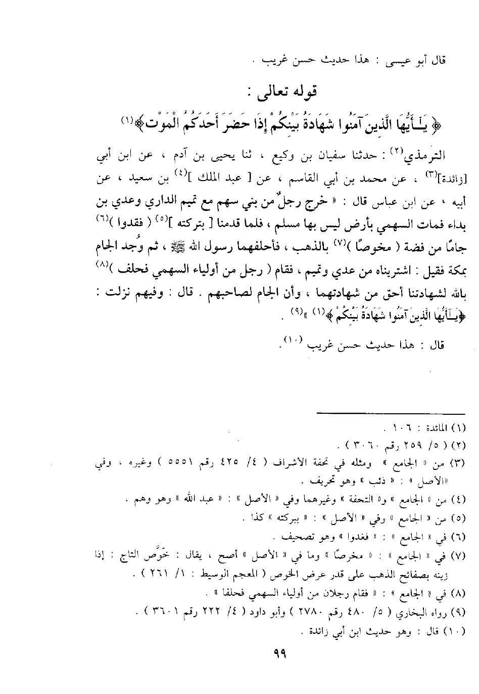 التِّرْمِذِيّ: حَدثنَا سُفْيَان بن وَكِيع، ثَنَا يحيى بن آدم، عَن ابْن أبي [زَائِدَة] ، عَن مُحَمَّد بن أبي الْقَاسِم، عَن [عبد الْملك] بن سعيد، عَن أَبِيه، عَن ابْن عَبَّاس قَالَ: " خرج رجل من بني سهم مَعَ تَمِيم الدَّارِيّ وعدي بن بداء فَمَاتَ السَّهْمِي بِأَرْض لَيْسَ بهَا مُسلم، فَلَمَّا قدمنَا [بِتركَتِهِ] (فقدوا) جَاما من فضَّة (مخوصا) بِالذَّهَب، فَأَحْلفهُمَا رَسُول الله - صَلَّى اللَّهُ عَلَيْهِ وَسَلَّم َ -، ثمَّ وجد الْجَام بِمَكَّة فَقيل: اشْتَرَيْنَاهُ من عدي وَتَمِيم، فَقَامَ (رجل من أَوْلِيَاء السَّهْمِي فَحلف) بِاللَّه لَشَهَادَتنَا أَحَق من شهادئهما، وَأَن الْجَام لصَاحِبِهِمْ. قَالَ: وَفِيهِمْ نزلت: {يَا أَيهَا الَّذين آمنُوا شَهَادَة بَيْنكُم} ".