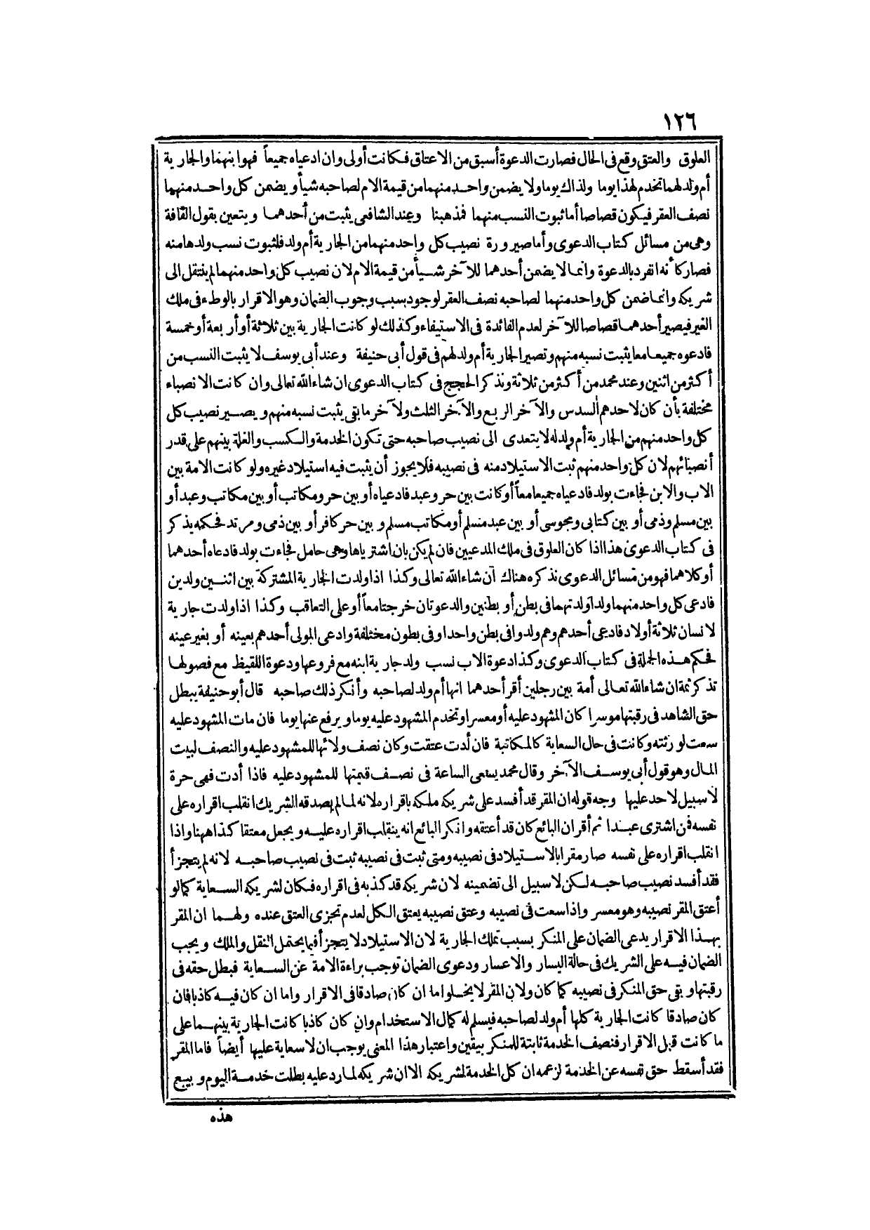 وَأَمَّا صَيْرُورَةُ نَصِيبِ كُلِّ وَاحِدٍ مِنْهُمَا مِنْ الْجَارِيَةِ أُمَّ وَلَدٍ فَلِثُبُوتِ نَسَبِ وَلَدِهَا مِنْهُ، فَصَارَ كَأَنَّهُ انْفَرَدَ بِالدَّعْوَةِ، وَإِنَّمَا لَا يَضْمَنُ أَحَدُهُمَا لِلْآخَرِ شَيْئًا مِنْ قِيمَةِ الْأُمِّ؛ لِأَنَّ نَصِيبَ كُلِّ وَاحِدٍ مِنْهُمَا لَمْ يَنْتَقِلْ إلَى شَرِيكِهِ، وَإِنَّمَا ضَمِنَ كُلُّ وَاحِدٍ مِنْهُمَا لِصَاحِبِهِ نِصْفَ الْعُقْرِ لِوُجُودِ سَبَبِ وُجُوبِ الضَّمَانِ، وَهُوَ الْإِقْرَارُ بِالْوَطْءِ فِي مِلْكِ الْغَيْرِ فَيَصِيرُ أَحَدُهُمَا قِصَاصًا لِلْآخَرِ لِعَدَمِ الْفَائِدَةِ فِي الِاسْتِيفَاءِ، وَكَذَلِكَ لَوْ كَانَتْ الْجَارِيَةُ بَيْنَ ثَلَاثَةٍ أَوْ أَرْبَعَةٍ أَوْ خَمْسَةٍ فَادَّعُوهُ جَمِيعًا مَعًا يَثْبُتُ نَسَبُهُ مِنْهُمْ، وَتَصِيرُ الْجَارِيَةُ أُمَّ وَلَدِهِمْ فِي قَوْلِ أَبِي حَنِيفَةَ، وَعِنْدَ أَبِي يُوسُفَ لَا يَثْبُتُ النَّسَبُ مِنْ أَكْثَرَ مِنْ اثْنَيْنِ، وَعِنْدَ مُحَمَّدٍ مِنْ أَكْثَرَ مِنْ ثَلَاثَةٍ، وَنَذْكُرُ الْحِجَجَ فِي كِتَابِ الدَّعْوَى إنْ شَاءَ اللَّهُ تَعَالَى، وَإِنْ كَانَتْ الْأَنْصِبَاءُ مُخْتَلِفَةً بِأَنْ كَانَ لِأَحَدِهِمْ السُّدُسُ، وَالْآخَرِ الرُّبُعُ، وَالْآخَرِ الثُّلُثُ، وَلِآخَرَ مَا بَقِيَ يَثْبُتُ نَسَبُهُ مِنْهُمْ وَيَصِيرُ نَصِيبُ كُلِّ وَاحِدٍ مِنْهُمْ مِنْ الْجَارِيَةِ أُمَّ وَلَدٍ لَهُ، لَا يَتَعَدَّى إلَى نَصِيبِ صَاحِبِهِ حَتَّى تَكُونَ الْخِدْمَةُ وَالْكَسْبُ وَالْغَلَّةُ بَيْنَهُمْ عَلَى قَدْرِ أَنْصِبَائِهِمْ؛ لِأَنَّ كُلَّ وَاحِدٍ مِنْهُمْ ثَبَتَ الِاسْتِيلَادُ مِنْهُ فِي نَصِيبِهِ، فَلَا يَجُوزُ أَنْ يَثْبُتَ فِيهِ اسْتِيلَادُ غَيْرِهِ، وَلَوْ كَانَتْ الْأَمَةُ بَيْنَ الْأَبِ وَالِابْنِ فَجَاءَتْ بِوَلَدٍ فَادَّعَيَاهُ جَمِيعًا مَعًا، أَوْ كَانَتْ بَيْنَ حُرٍّ وَعَبْدٍ فَادَّعَيَاهُ، أَوْ بَيْنَ حُرٍّ وَمُكَاتَبٍ، أَوْ بَيْنَ مُكَاتَبٍ وَعَبْدٍ، أَوْ بَيْنَ مُسْلِمٍ وَذِمِّيٍّ، أَوْ بَيْنَ كِتَابِيٍّ وَمَجُوسِيٍّ، أَوْ بَيْنَ عَبْدٍ مُسْلِمٍ أَوْ مُكَاتَبٍ مُسْلِمٍ وَبَيْنَ حُرٍّ كَافِرٍ، أَوْ بَيْنَ ذِمِّيٍّ وَمُرْتَدٍّ، فَحُكْمُهُ يُذْكَرُ فِي كِتَابِ الدَّعْوَى، هَذَا إذَا كَانَ الْعُلُوقُ فِي مِلْكِ الْمُدَّعِيَيْنِ، فَإِنْ لَمْ يَكُنْ بِأَنْ اشْتَرَيَاهَا وَهِيَ حَامِلٌ فَجَاءَتْ بِوَلَدٍ فَادَّعَاهُ أَحَدُهُمَا أَوْ كِلَاهُمَا فَهُوَ مِنْ مَسَائِلِ الدَّعْوَى نَذْكُرهُ هُنَاكَ إنْ شَاءَ اللَّهُ تَعَالَى وَكَذَا إذَا وَلَدَتْ الْجَارِيَةُ الْمُشْتَرَكَةُ بَيْنَ اثْنَيْنِ وَلَدَيْنِ، فَادَّعَى كُلُّ وَاحِدٍ مِنْهُمَا وَلَدًا وَلَدَتْهُمَا فِي بَطْنٍ أَوْ بَطْنَيْنِ وَالدَّعْوَتَانِ خَرَجَتَا مَعًا أَوْ عَلَى التَّعَاقُبِ، وَكَذَا إذَا وَلَدَتْ جَارِيَةٌ لِإِنْسَانٍ ثَلَاثَةَ أَوْلَادٍ فَادَّعَى أَحَدُهُمْ وَهُمْ وُلِدُوا فِي بَطْنٍ وَاحِدٍ أَوْ فِي بُطُونٍ مُخْتَلِفَةٍ وَادَّعَى الْمَوْلَى أَحَدَهُمْ بِعَيْنِهِ أَوْ بِغَيْرِ عَيْنِهِ فَحُكْمُ هَذِهِ الْجُمْلَةِ فِي كِتَابِ الدَّعْوَى وَكَذَا دَعْوَةُ الْأَبِ نَسَبَ وَلَدِ جَارِيَةِ ابْنِهِ مَعَ فُرُوعِهَا، وَدَعْوَةُ اللَّقِيطِ مَعَ فُصُولِهَا تُذْكَرُ ثَمَّةَ إنْ شَاءَ اللَّهُ تَعَالَى.