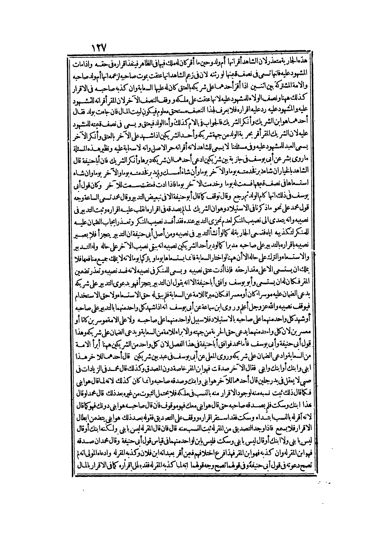 هَذِهِ الْجَارِيَةِ مُتَعَذِّرٌ؛ لِأَنَّ الشَّاهِدَ أَقَرَّ أَنَّهَا أُمُّ وَلَدٍ، وَحِينَمَا أَقَرَّ كَانَ لَهُ مِلْكٌ فِيهَا فِي الظَّاهِرِ فَيَنْفُذُ إقْرَارُهُ فِي حَقِّهِ، وَإِذَا مَاتَ الْمَشْهُودُ عَلَيْهِ فَإِنَّهَا تَسْعَى فِي نِصْفِ قِيمَتِهَا لِوَرَثَتِهِ؛ لِأَنَّ فِي زَعْمِ الشَّاهِدِ أَنَّهَا عَتَقَتْ بِمَوْتِ صَاحِبِهِ لِزَعْمِهِ أَنَّهَا أُمُّ وَلَدِ صَاحِبِهِ، وَالْأَمَةُ الْمُشْتَرَكَةُ بَيْنَ اثْنَيْنِ إذَا أَقَرَّ أَحَدُهُمَا عَلَى شَرِيكِهِ بِالْعِتْقِ كَانَ لَهُ عَلَيْهَا السِّعَايَةُ وَإِنْ كَذَّبَهُ صَاحِبُهُ فِي الْإِقْرَارِ، كَذَلِكَ هَهُنَا وَنِصْفُ الْوَلَاءِ لِلْمَشْهُودِ عَلَيْهِ لِأَنَّهَا عَتَقَتْ عَلَى مِلْكِهِ وَوَقَفَ النِّصْفَ الْآخَرَ؛ لِأَنَّ الْمُقِرَّ أَقَرَّ أَنَّهُ لِلْمَشْهُودِ عَلَيْهِ، وَالْمَشْهُودُ عَلَيْهِ رَدَّ عَلَيْهِ إقْرَارَهُ فَلَا يُعْرَفُ لِهَذَا النِّصْفِ مُسْتَحَقٌّ مَعْلُومٌ فَيَكُونَ لِبَيْتِ الْمَالِ فَإِنْ جَاءَتْ بِوَلَدٍ فَقَالَ أَحَدُهُمَا: هُوَ ابْنُ الشَّرِيكِ وَأَنْكَرَ الشَّرِيكُ فَالْجَوَابُ فِي الْأُمِّ كَذَلِكَ.