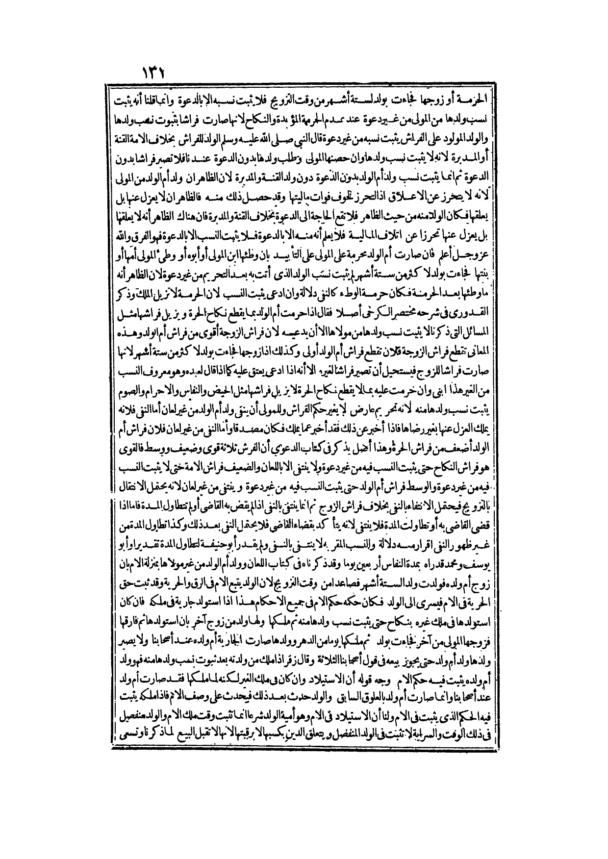 الْحُرْمَةِ، أَوْ زَوَّجَهَا فَجَاءَتْ بِوَلَدٍ لِسِتَّةِ أَشْهُرٍ مِنْ وَقْتِ التَّزْوِيجِ فَلَا يَثْبُتُ نَسَبُهُ إلَّا بِالدَّعْوَةِ، وَإِنَّمَا قُلْنَا إنَّهُ يَثْبُتُ نَسَبُ وَلَدِهَا مِنْ الْمَوْلَى مِنْ غَيْرِ دَعْوَةٍ عِنْدَ عَدَمِ الْحُرْمَةِ الْمُؤَبَّدَةِ وَالنِّكَاحِ؛ لِأَنَّهَا صَارَتْ فِرَاشًا بِثُبُوتِ نَسَبِ وَلَدِهَا، وَالْوَلَدُ الْمَوْلُودُ عَلَى الْفِرَاشِ يَثْبُتُ نَسَبُهُ مِنْ غَيْرِ دَعْوَةٍ قَالَ النَّبِيُّ - صَلَّى اللَّهُ عَلَيْهِ وَسَلَّمَ - «الْوَلَدُ لِلْفِرَاشِ» بِخِلَافِ الْأَمَةِ الْقِنَّةِ أَوْ الْمُدَبَّرَةِ؛ لِأَنَّهُ لَا يَثْبُتُ نَسَبُ وَلَدِهَا، وَإِنْ حَصَّنَهَا الْمَوْلَى وَطَلَب وَلَدَهَا بِدُونِ الدَّعْوَةِ عِنْدَنَا، فَلَا تَصِيرُ فِرَاشًا بِدُونِ الدَّعْوَةِ، ثُمَّ إنَّمَا يَثْبُتُ نَسَبُ وَلَدِ أُمِّ الْوَلَدِ بِدُونِ الدَّعْوَةِ دُونَ وَلَدِ الْقِنَّةِ وَالْمُدَبَّرَةِ؛ لِأَنَّ الظَّاهِرَ أَنَّ وَلَدَ أُمِّ الْوَلَدِ مِنْ الْمَوْلَى؛ لِأَنَّهُ لَا يَتَحَرَّزُ عَنْ الْإِعْلَاقِ، إذْ التَّحَرُّزُ لِخَوْفِ فَوَاتِ مَالِيَّتِهَا وَقَدْ حَصَلَ ذَلِكَ مِنْهُ، فَالظَّاهِرُ أَنْ لَا يَعْزِلَ عَنْهَا بَلْ يُعَلِّقُهَا فَكَانَ الْوَلَدُ مِنْهُ مِنْ حَيْثُ الظَّاهِرُ فَلَا تَقَعُ الْحَاجَةُ إلَى الدَّعْوَةِ، بِخِلَافِ الْقِنَّةِ وَالْمُدَبَّرَةُ، فَإِنَّ هُنَاكَ الظَّاهِرُ أَنَّهُ لَا يُعَلِّقُهَا بَلْ يَعْزِلُ عَنْهَا تَحَرُّزًا عَنْ إتْلَافِ الْمَالِيَّةِ، فَلَا يُعْلَمُ أَنَّهُ مِنْهُ إلَّا بِالدَّعْوَةِ، فَلَا يَثْبُتُ النَّسَبُ إلَّا بِالدَّعْوَةِ، فَهُوَ الْفَرْقُ - وَاَللَّهُ عَزَّ وَجَلَّ أَعْلَمُ.