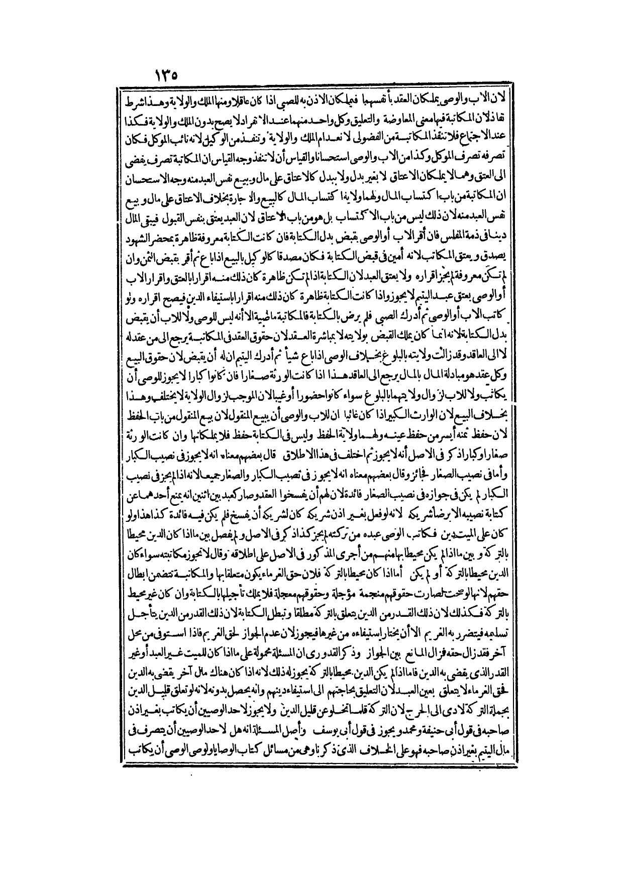 وَأَمَّا فِي نَصِيبِ الصِّغَارِ فَجَائِزٌ وَقَالَ بَعْضُهُمْ: مَعْنَاهُ أَنَّهُ لَا يَجُوزُ فِي نَصِيبِ الْكِبَارِ وَالصِّغَارِ جَمِيعًا؛ لِأَنَّهُ إذَا لَمْ يَجُزْ فِي نَصِيبِ الْكِبَارِ لَمْ يَكُنْ فِي جَوَازِهِ فِي نَصِيبِ الصِّغَارِ فَائِدَةٌ؛ لِأَنَّ لَهُمْ أَنْ يَفْسَخُوا الْعَقْدَ وَصَارَ كَعَبْدٍ بَيْنَ اثْنَيْنِ أَنَّهُ يُمْنَعُ أَحَدُهُمَا عَنْ كِتَابَةِ نَصِيبِهِ إلَّا بِرِضَا شَرِيكِهِ؛ لِأَنَّهُ لَوْ فَعَلَ بِغَيْرِ إذْنِ شَرِيكِهِ كَانَ لِشَرِيكِهِ أَنْ يَفْسَخَ فَلَمْ يَكُنْ فِيهِ فَائِدَةٌ كَذَا هَذَا، وَلَوْ كَانَ عَلَى الْمَيِّتِ دَيْنٌ فَكَاتَبَ الْوَصِيُّ عَبْدَهُ مِنْ تَرِكَتِهِ لَمْ يَجُزْ كَذَا ذَكَرَ فِي الْأَصْلِ وَلَمْ يَفْصِلْ بَيْنَ مَا إذَا كَانَ الدَّيْنُ مُحِيطًا بِالتَّرِكَةِ وَبَيْنَ مَا إذَا لَمْ يَكُنْ مُحِيطًا بِهَا، مِنْهُمْ مَنْ أَجْرَى الْمَذْكُورَ فِي الْأَصْلِ عَلَى إطْلَاقِهِ وَقَالَ: لَا تَجُوزُ مُكَاتَبَتُهُ، سَوَاءٌ كَانَ الدَّيْنُ مُحِيطًا بِالتَّرِكَةِ أَوْ لَمْ يَكُنْ أَمَّا إذَا كَانَ مُحِيطًا بِالتَّرِكَةِ فَلِأَنَّ حَقَّ الْغُرَمَاءِ يَكُونُ مُتَعَلِّقًا بِهَا، وَالْمُكَاتَبَةُ تَتَضَمَّنُ إبْطَالَ حَقِّهِمْ؛ لِأَنَّهَا لَوْ صَحَّتْ لَصَارَتْ حُقُوقُهُمْ مُنَجَّمَةً مُؤَجَّلَةً، وَحُقُوقُهُمْ مُعَجَّلَةٌ فَلَا يَمْلِكُ تَأْجِيلَهَا بِالْكِتَابَةِ، وَإِنْ كَانَ غَيْرَ مُحِيطٍ بِالتَّرِكَةِ فَكَذَلِكَ؛ لِأَنَّ ذَلِكَ الْقَدْرَ مِنْ الدَّيْنِ يَتَعَلَّقُ بِالتَّرِكَةِ مُطْلَقًا وَتَبْطُلُ الْكِتَابَةُ؛ لِأَنَّ ذَلِكَ الْقَدْرَ مِنْ الدَّيْنِ يَتَأَجَّلُ تَسْلِيمُهُ فَيَتَضَرَّرُ بِهِ الْغَرِيمُ إلَّا أَنْ يَخْتَارَ اسْتِيفَاءَهُ مِنْ غَيْرِهَا فَيَجُوزُ؛ لِأَنَّ عَدَمَ الْجَوَازِ لِحَقِّ الْغَرِيمِ، فَإِذَا اسْتَوْفَى مِنْ مَحَلٍّ آخَرَ فَقَدْ زَالَ حَقُّهُ فَزَالَ الْمَانِعُ بَيْنَ الْجَوَازِ، وَذَكَرَ الْقُدُورِيُّ أَنَّ الْمَسْأَلَةَ مَحْمُولَةٌ عَلَى مَا إذَا كَانَ لِلْمَيِّتِ غَيْرُ الْعَبْدِ أَوْ غَيْرُ الْقَدْرِ الَّذِي يَقْضِي بِهِ الدَّيْنَ.