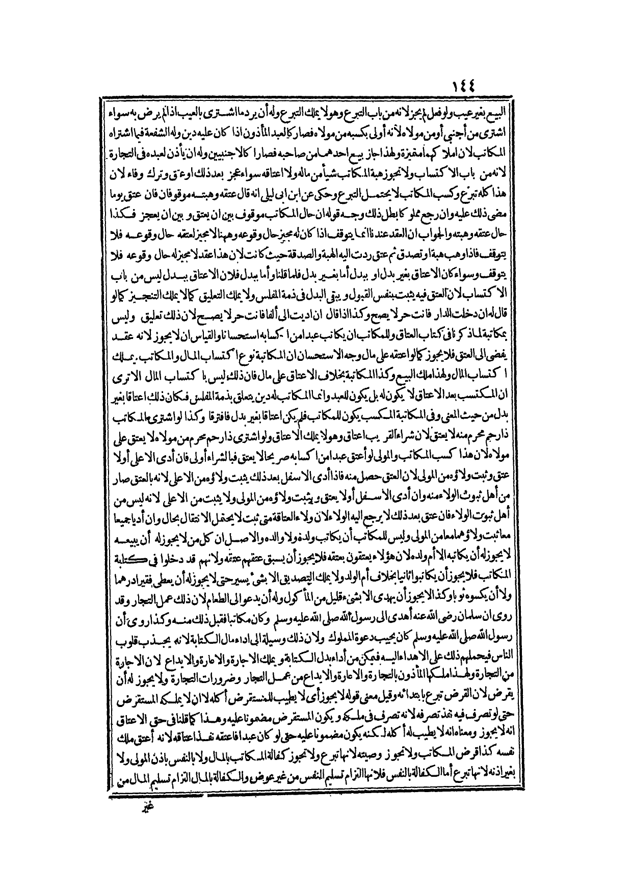 الْبَيْعِ بِغَيْرِ عَيْبٍ وَلَوْ فَعَلَ لَمْ يَجُزْ؛ لِأَنَّهُ مِنْ بَابِ التَّبَرُّعِ وَهُوَ لَا يَمْلِكُ التَّبَرُّعَ، وَلَهُ أَنْ يَرُدَّ مَا اشْتَرَى بِالْعَيْبِ إذَا لَمْ يَرْضَ بِهِ سَوَاءٌ اشْتَرَى مِنْ أَجْنَبِيٍّ أَوْ مِنْ مَوْلَاهُ؛ لِأَنَّهُ أَوْلَى بِكَسْبِهِ مِنْ مَوْلَاهُ فَصَارَ كَالْعَبْدِ الْمَأْذُونِ إذَا كَانَ عَلَيْهِ دَيْنٌ، وَلَهُ الشُّفْعَةُ فِيمَا اشْتَرَاهُ الْمُكَاتَبُ؛ لِأَنَّ أَمْلَاكَهُمَا مُتَمَيِّزَةٌ وَلِهَذَا جَازَ بَيْعُ أَحَدِهِمَا مِنْ صَاحِبِهِ فَصَارَا كَالْأَجْنَبِيَّيْنِ وَلَهُ أَنْ يَأْذَنَ لِعَبْدِهِ فِي التِّجَارَةِ؛ لِأَنَّهُ مِنْ بَابِ الِاكْتِسَابِ.