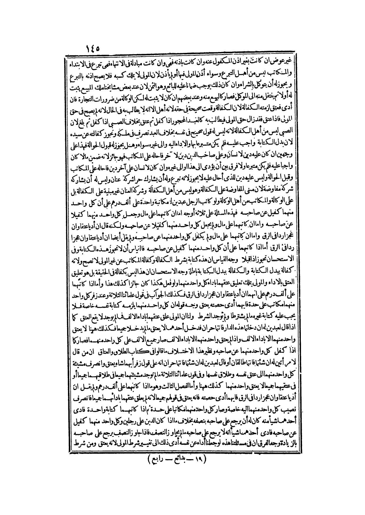 وَلَوْ كَاتَبَ الرَّجُلُ عَبْدَيْنِ لَهُ مُكَاتَبَةً وَاحِدَةً عَلَى أَلْفِ دِرْهَمٍ عَلَى أَنَّ كُلَّ وَاحِدٍ مِنْهُمَا كَفِيلٌ عَنْ صَاحِبِهِ فَهَذِهِ الْمَسْأَلَةُ عَلَى ثَلَاثَةِ أَوْجُهٍ: إمَّا إنْ كَاتَبَهُمَا عَلَى مَالٍ وَجَعَلَ كُلَّ وَاحِدٍ مِنْهُمَا كَفِيلًا عَنْ صَاحِبِهِ.