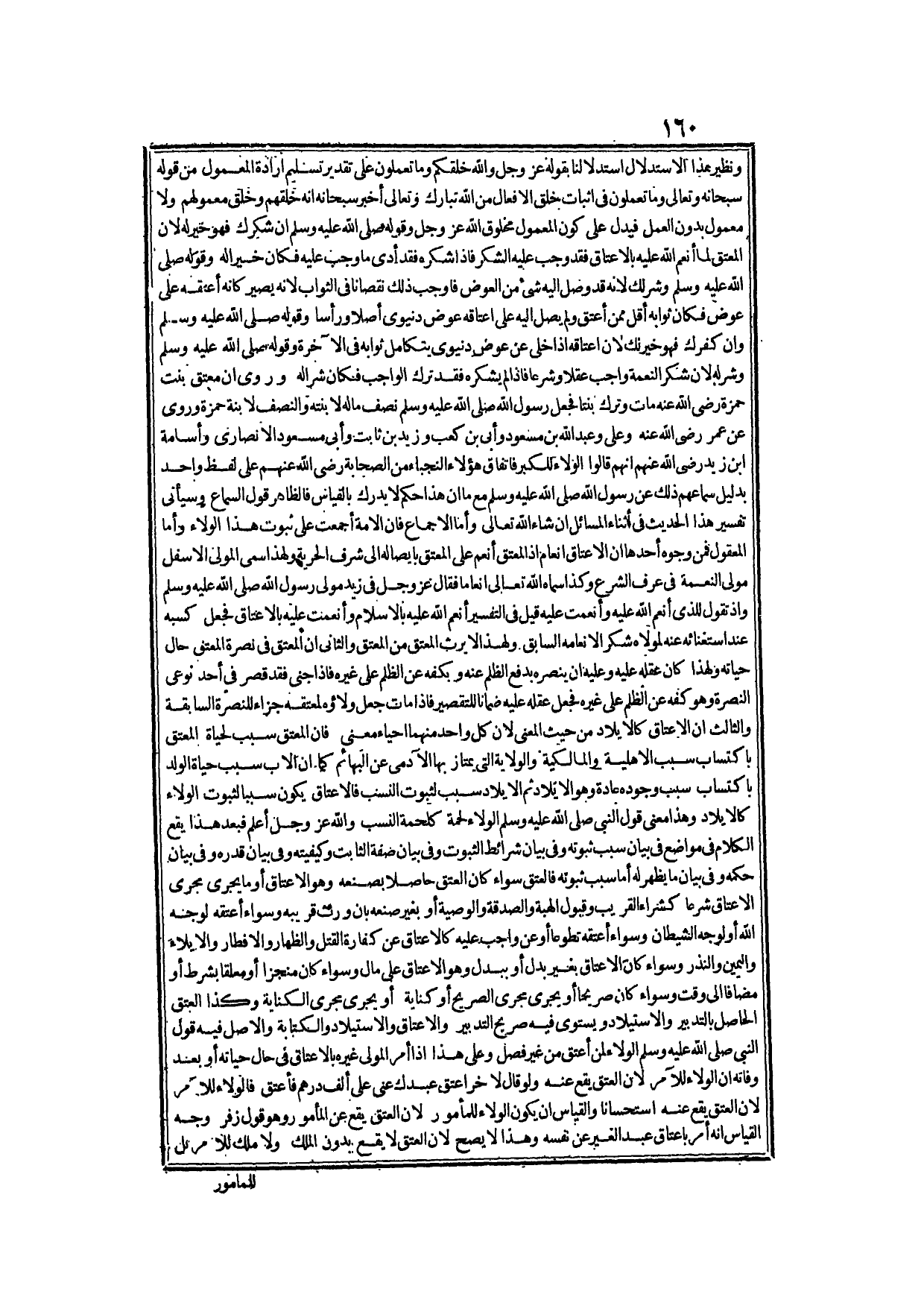 وَنَظِيرُ هَذَا الِاسْتِدْلَالِ اسْتِدْلَالُنَا بِقَوْلِهِ عَزَّ وَجَلَّ: {وَاللَّهُ خَلَقَكُمْ وَمَا تَعْمَلُونَ} [الصافات: 96] عَلَى تَقْدِيرِ تَسْلِيمِ إرَادَةِ الْمَعْمُولِ مِنْ قَوْلِهِ - سُبْحَانَهُ وَتَعَالَى - وَمَا تَعْمَلُونَ فِي إثْبَاتِ خَلْقِ الْأَفْعَالِ مِنْ اللَّهِ تَبَارَكَ وَتَعَالَى، أَخْبَرَ سُبْحَانَهُ أَنَّهُ خَلَقَهُمْ وَخَلَقَ مَعْمُولَهُمْ، وَلَا مَعْمُولَ بِدُونِ الْعَمَلِ فَيَدُلُّ عَلَى كَوْنِ الْمَعْمُولِ مَخْلُوقَ اللَّهِ عَزَّ وَجَلَّ، وَقَوْلُهُ - صَلَّى اللَّهُ عَلَيْهِ وَسَلَّمَ -: إنْ شَكَرَك فَهُوَ خَيْرٌ لَهُ؛ لِأَنَّ الْمُعْتَقَ لَمَّا أَنْعَمَ اللَّهُ عَلَيْهِ بِالْإِعْتَاقِ فَقَدْ وَجَبَ عَلَيْهِ الشُّكْرُ، فَإِذَا شَكَرَهُ فَقَدْ أَدَّى مَا وَجَبَ عَلَيْهِ، فَكَانَ خَيْرًا لَهُ، وَقَوْلُهُ - صَلَّى اللَّهُ عَلَيْهِ وَسَلَّمَ -: وَشَرٌّ لَك؛ لِأَنَّهُ قَدْ وَصَلَ إلَيْهِ شَيْءٌ مِنْ الْعِوَضِ فَأَوْجَبَ ذَلِكَ نُقْصَانًا فِي الثَّوَابِ؛ لِأَنَّهُ يَصِيرُ كَأَنَّهُ أَعْتَقَهُ عَلَى عِوَضٍ، فَكَانَ ثَوَابُهُ أَقَلَّ مِمَّنْ أَعْتَقَ وَلَمْ يَصِلْ إلَيْهِ عَلَى إعْتَاقِهِ عِوَضٌ دُنْيَوِيٌّ أَصْلًا وَرَأْسًا، وَقَوْلُهُ - صَلَّى اللَّهُ عَلَيْهِ وَسَلَّمَ -: وَإِنْ كَفَرَك فَهُوَ خَيْرٌ لَك؛ لِأَنَّ إعْتَاقَهُ إذَا خَلَا عَنْ عِوَضٍ دُنْيَوِيٍّ يَتَكَامَلُ ثَوَابُهُ فِي الْآخِرَةِ، وَقَوْلُهُ - صَلَّى اللَّهُ عَلَيْهِ وَسَلَّمَ -: وَشَرٌّ لَهُ؛ لِأَنَّ شُكْرَ النِّعْمَةِ وَاجِبٌ عَقْلًا وَشَرْعًا، فَإِذَا لَمْ يَشْكُرْهُ فَقَدْ تَرَكَ الْوَاجِبَ، فَكَانَ شَرًّا لَهُ.