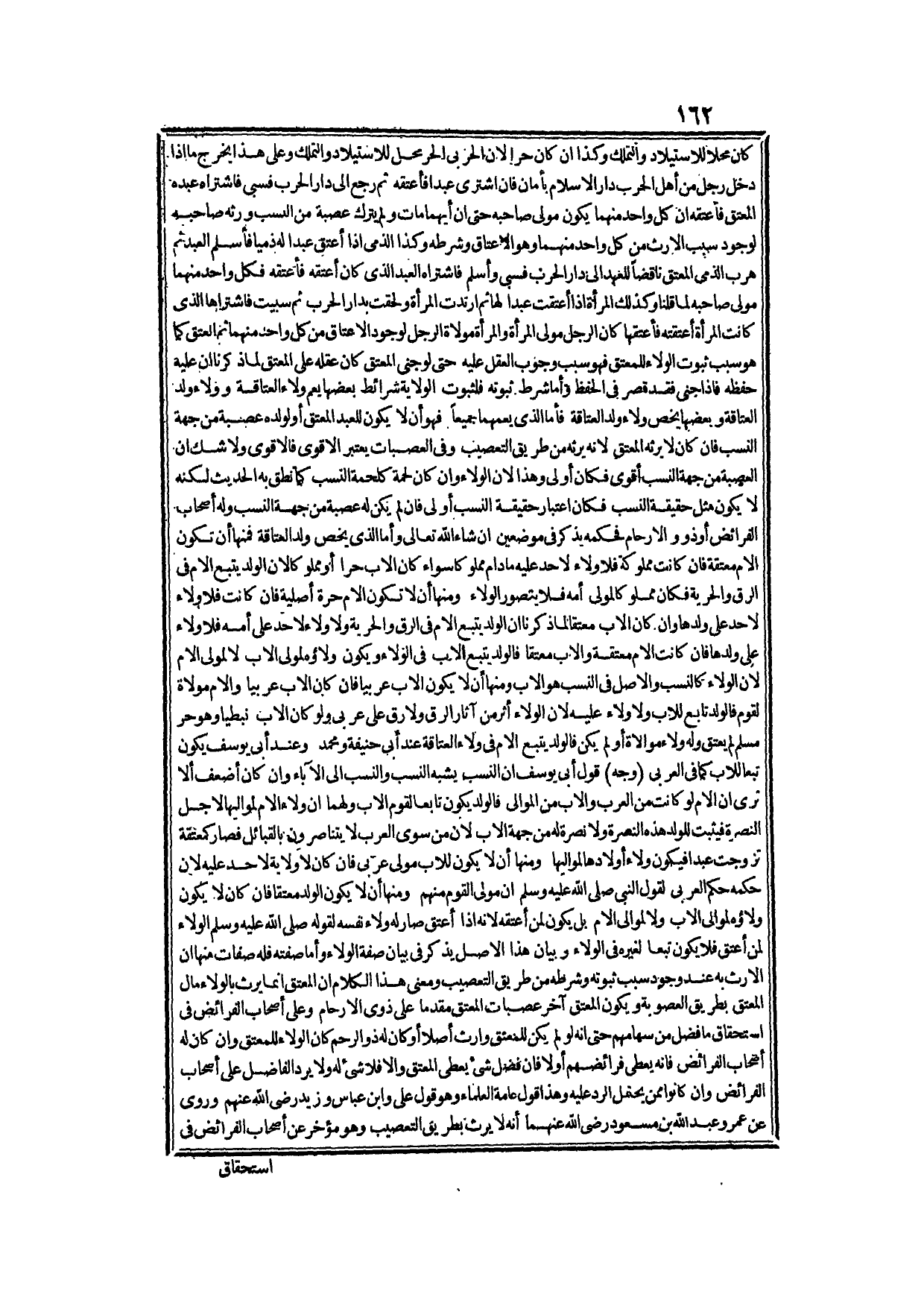 وَأَمَّا صِفَتُهُ فَلَهُ صِفَاتٌ مِنْهَا أَنَّ الْإِرْثَ بِهِ عِنْدَ وُجُودِ سَبَبِ ثُبُوتِهِ وَشَرْطِهِ مِنْ طَرِيقِ التَّعْصِيبِ وَمَعْنَى هَذَا الْكَلَامِ أَنَّ الْمُعْتِقَ إنَّمَا يَرِثُ بِالْوَلَاءِ مَالَ الْمُعْتَقِ بِطَرِيقِ الْعُصُوبَةِ وَيَكُونُ الْمُعْتِقُ آخِرَ عَصَبَاتِ الْمُعْتَقِ مُقَدَّمًا عَلَى ذَوِي الْأَرْحَامِ وَعَلَى أَصْحَابِ الْفَرَائِضِ فِي اسْتِحْقَاقِ مَا فَضَلَ مِنْ سِهَامِهِمْ حَتَّى إنَّهُ لَوْ لَمْ يَكُنْ لِلْمُعْتَقِ وَارِثٌ أَصْلًا، أَوْ كَانَ لَهُ ذُو الرَّحِمِ كَانَ الْوَلَاءُ لِلْمُعْتِقِ، وَإِنْ كَانَ لَهُ أَصْحَابُ الْفَرَائِضِ فَإِنَّهُ يُعْطَى فَرَائِضَهُمْ أَوَّلًا، فَإِنْ فَضَلَ شَيْءٌ يُعْطَى الْمُعْتِقَ وَإِلَّا فَلَا شَيْءَ لَهُ وَلَا يُرَدُّ الْفَاضِلُ عَلَى أَصْحَابِ الْفَرَائِضِ، وَإِنْ كَانُوا مِمَّنْ يُحْتَمَلُ الرَّدُّ عَلَيْهِ، وَهَذَا قَوْلُ عَامَّةِ الْعُلَمَاءِ، وَهُوَ قَوْلُ عَلِيٍّ وَابْنِ عَبَّاسٍ وَزَيْدٍ - رَضِيَ اللَّهُ عَنْهُمْ -.