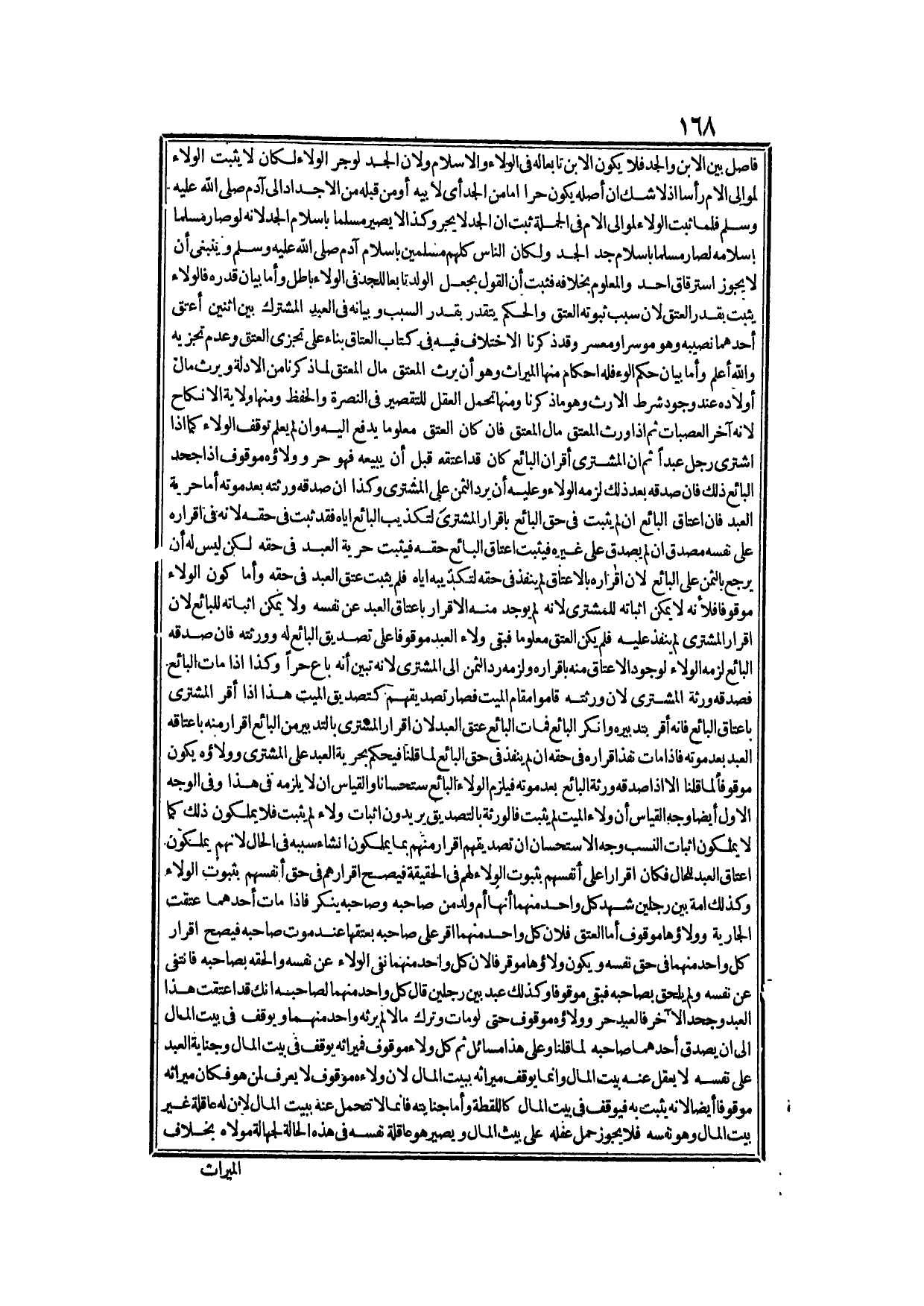 فَاصِلٌ بَيْنَ الِابْنِ وَالْجَدِّ، فَلَا يَكُونُ الِابْنُ تَابِعًا لَهُ فِي الْوَلَاءِ وَالْإِسْلَامِ، لِأَنَّ الْجَدَّ لَوْ جَرَّ الْوَلَاءَ لَكَانَ لَا يَثْبُتُ الْوَلَاءُ لِمَوَالِي الْأُمِّ رَأْسًا، إذْ لَا شَكَّ أَنَّ أَصْلَهُ يَكُونُ حُرًّا أَمَّا مِنْ الْجَدِّ أَيْ لِأَبِيهِ أَوْ مِنْ قِبَلِهِ مِنْ الْأَجْدَادِ إلَى آدَمَ - صَلَّى اللَّهُ عَلَيْهِ وَسَلَّمَ - فَلَمَّا ثَبَتَ الْوَلَاءُ لِمَوَالِي الْأُمِّ فِي الْجُمْلَةِ ثَبَتَ أَنَّ الْجَدَّ لَا يَجُرُّ، وَكَذَا لَا يَصِيرُ مُسْلِمًا بِإِسْلَامِ الْجَدِّ؛ لِأَنَّهُ لَوْ صَارَ مُسْلِمًا بِإِسْلَامِهِ لَصَارَ مُسْلِمًا بِإِسْلَامِ جَدِّ الْجَدِّ، وَلَكَانَ النَّاسُ كُلُّهُمْ مُسْلِمِينَ بِإِسْلَامِ آدَمَ - صَلَّى اللَّهُ عَلَيْهِ وَسَلَّمَ - وَيَنْبَغِي أَنْ لَا يَجُوزَ اسْتِرْقَاقُ أَحَدٍ، وَالْمَعْلُومُ بِخِلَافِهِ فَثَبَتَ أَنَّ الْقَوْلَ بِجَعْلِ الْوَلَدِ تَابِعًا لِلْجَدِّ فِي الْوَلَاءِ بَاطِلٌ.