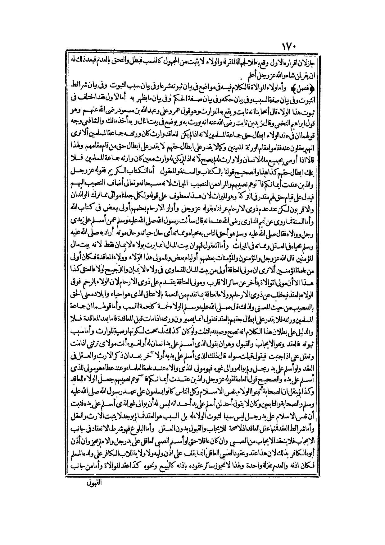 بَيَانِ سَبَبِ الثُّبُوتِ وَفِي بَيَانِ شَرَائِطِ الثُّبُوتِ، وَفِي بَيَانِ صِفَةِ السَّبَبِ، وَفِي بَيَانِ حُكْمِهِ وَفِي بَيَانِ صِفَةِ الْحُكْمِ، وَفِي بَيَانِ مَا يَظْهَرُ بِهِ أَمَّا الْأَوَّلُ فَقَدْ اُخْتُلِفَ فِي ثُبُوتِ هَذَا الْوَلَاءِ.