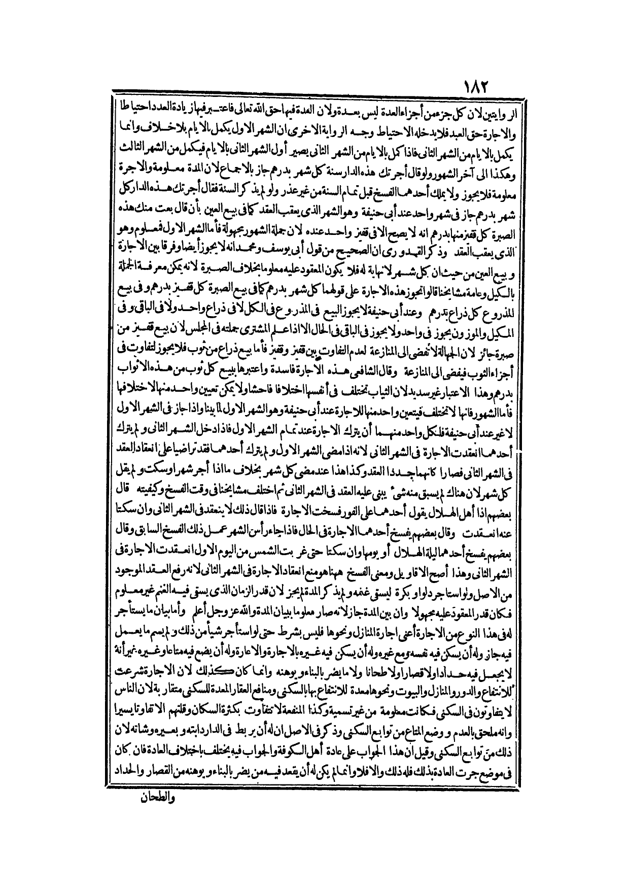 الرِّوَايَتَيْنِ؛ لِأَنَّ كُلَّ جُزْءٍ مِنْ أَجْزَاءِ الْعِدَّةِ لَيْسَ بِعِدَّةٍ؛ وَلِأَنَّ الْعِدَّةَ فِيهَا حَقُّ اللَّهِ تَعَالَى فَاعْتُبِرَ فِيهَا زِيَادَةُ الْعَدَدِ احْتِيَاطًا، وَالْإِجَارَةُ حَقُّ الْعَبْدِ فَلَا يَدْخُلُهُ الِاحْتِيَاطُ، وَجْهُ الرِّوَايَةِ الْأُخْرَى أَنَّ الشَّهْرَ الْأَوَّلَ يَكْمُلُ بِالْأَيَّامِ بِلَا خِلَافٍ، وَإِنَّمَا يَكْمُلُ بِالْأَيَّامِ مِنْ الشَّهْرُ الثَّانِي فَإِذَا كَمُلَ بِالْأَيَّامِ مِنْ الشَّهْرُ الثَّانِي يَصِير أَوَّلُ الشَّهْرِ الثَّانِي بِالْأَيَّامِ، فَيُكْمَلُ مِنْ الشَّهْرِ الثَّالِثِ وَهَكَذَا إلَى آخَرِ الشُّهُورِ، وَلَوْ قَالَ: أَجَرْتُك هَذِهِ الدَّارَ سَنَةً كُلَّ شَهْرٍ بِدِرْهَمٍ جَازَ بِالْإِجْمَاعِ؛ لِأَنَّ الْمُدَّةَ مَعْلُومَةٌ وَالْأُجْرَةَ مَعْلُومَةٌ فَلَا يَجُوزُ - وَلَا يَمْلِكُ أَحَدُهُمَا - الْفَسْخُ قَبْلَ تَمَامِ السَّنَةِ مِنْ غَيْرِ عُذْرٍ، وَلَوْ لَمْ يَذْكُرْ السَّنَةَ فَقَالَ: أَجَرْتُك هَذِهِ الدَّارَ كُلَّ شَهْرٍ بِدِرْهَمٍ جَازَ فِي شَهْرٍ وَاحِدٍ عِنْدَ أَبِي حَنِيفَةَ وَهُوَ الشَّهْرُ الَّذِي يَعْقُبُ الْعَقْدَ كَمَا فِي بَيْعِ الْعَيْنِ بِأَنْ قَالَ: بِعْت مِنْك هَذِهِ الصُّبْرَةَ كُلَّ قَفِيزٍ مِنْهَا بِدِرْهَمٍ أَنَّهُ لَا يَصِحُّ إلَّا فِي قَفِيزٍ وَاحِدٍ عِنْدَهُ؛ لِأَنَّ جُمْلَةَ الشُّهُورِ مَجْهُولَةٌ، فَأَمَّا الشَّهْرُ الْأَوَّلُ فَمَعْلُومٌ وَهُوَ الَّذِي يَعْقُبُ الْعَقْدَ، وَذَكَرَ الْقُدُورِيُّ أَنَّ الصَّحِيحَ مِنْ قَوْلِ أَبِي يُوسُفَ وَمُحَمَّدٍ أَنَّهُ لَا يَجُوزُ أَيْضًا، وَفَرَّقَا بَيْنَ الْإِجَارَةِ وَبَيْعِ الْعَيْنِ مِنْ حَيْثُ إنَّ كُلَّ شَهْرٍ لَا نِهَايَةَ لَهُ فَلَا يَكُونُ الْمَعْقُودُ عَلَيْهِ مَعْلُومًا بِخِلَافِ الصُّبْرَةِ؛ لِأَنَّهُ يُمْكِنُ مَعْرِفَةُ الْجُمْلَةِ بِالْكَيْلِ، وَعَامَّةُ مَشَايِخِنَا قَالُوا تَجُوزُ هَذِهِ الْإِجَارَةُ عَلَى قَوْلِهِمَا كُلُّ شَهْرٍ بِدِرْهَمٍ كَمَا فِي بَيْعِ الصُّبْرَةِ كُلُّ قَفِيزٍ بِدِرْهَمٍ وَفِي بَيْعِ الْمَذْرُوعِ كُلُّ ذِرَاعٍ بِدِرْهَمٍ، وَعِنْدَ أَبِي حَنِيفَةَ لَا يَجُوزُ الْبَيْعُ فِي الْمَذْرُوعِ فِي الْكُلِّ لَا فِي ذِرَاعٍ وَاحِدٍ وَلَا فِي الْبَاقِي، وَفِي الْمَكِيلِ وَالْمَوْزُونِ يَجُوزُ فِي وَاحِدٍ وَلَا يَجُوزُ فِي الْبَاقِي فِي الْحَالِ، إلَّا إذَا عَلِمَ الْمُشْتَرِي جُمْلَتَهُ فِي الْمَجْلِسِ؛ لِأَنَّ بَيْعَ قَفِيزٍ مِنْ صُبْرَةٍ جَائِزٌ؛ لِأَنَّ الْجَهَالَةَ لَا تُفْضِي إلَى الْمُنَازَعَةِ لِعَدَمِ التَّفَاوُتِ بَيْنَ قَفِيزٍ وَقَفِيزٍ فَأَمَّا بَيْعُ ذِرَاعٍ مِنْ ثَوْبٍ فَلَا يَجُوزُ لِتَفَاوُتٍ فِي أَجْزَاءِ الثَّوْبِ فَيُفْضِي إلَى الْمُنَازَعَةِ، وَقَالَ الشَّافِعِيُّ: هَذِهِ الْإِجَارَةُ فَاسِدَةٌ وَاعْتَبَرَهَا بِبَيْعِ كُلِّ ثَوْبٍ مِنْ هَذِهِ الْأَثْوَابِ بِدِرْهَمٍ، وَهَذَا الِاعْتِبَارُ غَيْرُ سَدِيدٍ لِأَنَّ الثِّيَابَ تَخْتَلِفُ فِي أَنْفُسِهَا اخْتِلَافًا فَاحِشًا، وَلَا يُمْكِنُ تَعْيِينُ وَاحِدٍ مِنْهَا لِاخْتِلَافِهَا، فَأَمَّا الشُّهُورُ فَإِنَّهَا لَا تَخْتَلِفُ فَيَتَعَيَّنُ وَاحِدٌ مِنْهَا لِلْإِجَارَةِ عِنْدَ أَبِي حَنِيفَةَ وَهُوَ الشَّهْرُ الْأَوَّلُ لِمَا بَيَّنَّا، وَإِذَا جَازَ فِي الشَّهْرِ الْأَوَّلِ لَا غَيْرَ عِنْدَ أَبِي حَنِيفَةَ فَلِكُلِّ وَاحِدٍ مِنْهُمَا أَنْ يَتْرُكَ الْإِجَارَةَ عِنْدَ تَمَامِ الشَّهْرِ الْأَوَّلِ، فَإِذَا دَخَلَ الشَّهْرُ الثَّانِي وَلَمْ يَتْرُكْ أَحَدُهُمَا انْعَقَدَتْ الْإِجَارَةُ فِي الشَّهْرِ الثَّانِي؛ لِأَنَّهُ إذَا مَضَى الشَّهْرُ الْأَوَّلُ وَلَمْ يَتْرُكْ أَحَدُهُمَا فَقَدْ تَرَاضَيَا عَلَى 