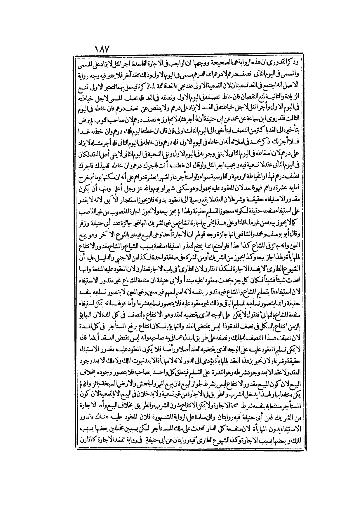 وَأَمَّا الْإِجَارَةُ مِنْ الشَّرِيكِ فَعَنْ أَبِي حَنِيفَةَ فِيهِ رِوَايَتَانِ وَلَئِنْ سَلَّمْنَا عَلَى الرِّوَايَةِ الْمَشْهُورَةِ فَلِأَنَّ الْمَعْقُودَ عَلَيْهِ هُنَاكَ مَقْدُورُ الِاسْتِيفَاءِ بِدُونِ الْمُهَايَأَةِ لِأَنَّ مَنْفَعَةَ كُلِّ الدَّارِ تَحْدُثُ عَلَى مِلْكِ الْمُسْتَأْجِرِ لَكِنْ بِسَبَبَيْنِ مُخْتَلِفَيْنِ بَعْضُهَا بِسَبَبِ الْمِلْكِ وَبَعْضُهَا بِسَبَبِ الْإِجَارَةِ وَكَذَا الشُّيُوعُ الطَّارِئُ فِيهِ رِوَايَتَانِ عَنْ أَبِي حَنِيفَةَ فِي رِوَايَةٍ تَفْسُدُ الْإِجَارَةُ كَالْمُقَارِنِ