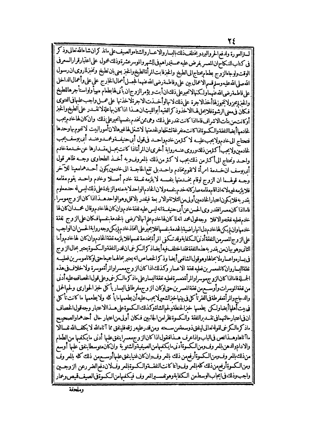 وَرُوِيَ عَنْهُ رِوَايَةٌ أُخْرَى أَنَّ الْمَرْأَةَ إذَا كَانَتْ يَجِلُّ مِقْدَارُهَا عَنْ خِدْمَةِ خَادِمٍ وَاحِدٍ وَتَحْتَاجُ إلَى أَكْثَرَ مِنْ ذَلِكَ يَجِبُ لِأَكْثَرَ مِنْ ذَلِكَ بِالْمَعْرُوفِ وَبِهِ أَخَذَ الطَّحَاوِيُّ وَجْهُ ظَاهِرِ قَوْلِ أَبِي يُوسُفَ إنَّ خِدْمَةَ امْرَأَةٍ لَا تَقُومُ بِخَادِمٍ وَاحِدٍ بَلْ تَقَعُ الْحَاجَةُ إلَى خَادِمَيْنِ يَكُونُ أَحَدُهُمَا مُعِينًا لِلْآخَرِ وَجْهُ قَوْلِهِمَا أَنَّ الزَّوْجَ لَوْ قَامَ بِخِدْمَتِهَا بِنَفْسِهِ لَا يَلْزَمُهُ نَفَقَةُ خَادِمٍ أَصْلًا وَخَادِمٌ وَاحِدٌ يَقُومُ مَقَامَهُ فَلَا يَلْزَمُهُ غَيْرُهُ؛ لِأَنَّهُ إذَا قَامَ مَقَامَهُ؛ صَارَ كَأَنَّهُ خَدَمَ بِنَفْسِهِ وَلِأَنَّ الْخَادِمَ الْوَاحِدَ لَا بُدَّ مِنْهُ وَالزِّيَادَةُ عَلَى ذَلِكَ لَيْسَ لَهُ حَدٌّ مَعْلُومٌ يُقَدَّرُ بِهِ فَلَا يَكُونُ اعْتِبَارُ الْخَادِمَيْنِ أَوْلَى مِنْ الثَّلَاثَةِ وَالْأَرْبَعَةِ فَيُقَدَّرَ بِالْأَقَلِّ وَهُوَ الْوَاحِدُ هَذَا إذَا كَانَ الزَّوْجُ مُوسِرًا فَأَمَّا إذَا كَانَ مُعْسِرًا فَقَدْ رَوَى الْحَسَنُ عَنْ أَبِي حَنِيفَةَ أَنَّهُ لَيْسَ عَلَيْهِ نَفَقَةُ خَادِمٍ وَإِنْ كَانَ لَهَا خَادِمٌ، وَقَالَ مُحَمَّدٌ: إنْ كَانَ لَهَا خَادِمٌ فَعَلَيْهِ نَفَقَتُهُ وَإِلَّا فَلَا، وَجْهُ قَوْلِ مُحَمَّدٍ أَنَّهُ لَمَّا كَانَ لَهَا خَادِمٌ عُلِمَ أَنَّهَا لَا تَرْضَى بِالْخِدْمَةِ بِنَفْسِهَا فَكَانَ عَلَى الزَّوْجِ نَفَقَةُ خَادِمِهَا وَإِنْ لَمْ يَكُنْ لَهَا خَادِمٌ؛ دَلَّ أَنَّهَا رَاضِيَةٌ بِالْخِدْمَةِ بِنَفْسِهَا فَلَا يُجْبَرُ عَلَى اتِّخَاذِ خَادِمٍ لَمْ يَكُنْ، وَجْهُ رِوَايَةِ الْحَسَنِ أَنَّ الْوَاجِبَ عَلَى الزَّوْجِ الْمُعْسِرِ مِنْ النَّفَقَةِ أَدْنَى الْكِفَايَةِ، وَقَدْ تُكْفَى الْمَرْأَةُ بِخِدْمَةِ نَفْسِهَا فَلَا يَلْزَمُهُ نَفَقَةُ الْخَادِمِ وَإِنْ كَانَ لَهَا خَادِمٌ.