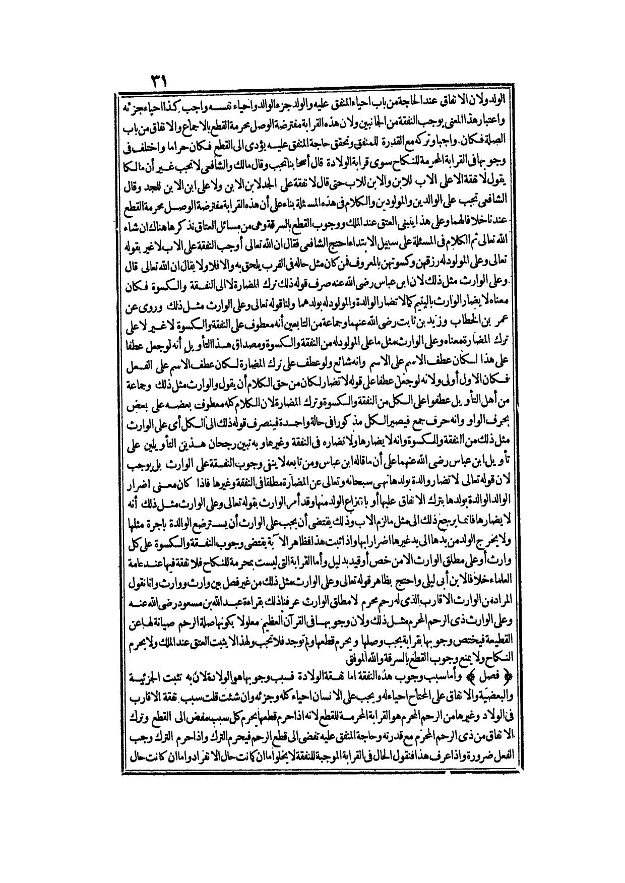 الْوَلَدِ وَلِأَنَّ الْإِنْفَاقَ عِنْدَ الْحَاجَةَ مِنْ بَابِ إحْيَاءِ الْمُنْفَقِ عَلَيْهِ وَالْوَلَدُ جُزْءُ الْوَالِدِ وَإِحْيَاءُ نَفْسِهِ وَاجِبٌ كَذَا إحْيَاءُ جُزْئِهِ وَاعْتِبَارُ هَذَا الْمَعْنَى يُوجِبُ النَّفَقَةَ مِنْ الْجَانِبَيْنِ وَلِأَنَّ هَذِهِ الْقَرَابَةَ مُفْتَرَضَةُ الْوَصْلِ مُحَرَّمَةُ الْقَطْعِ بِالْإِجْمَاعِ وَالْإِنْفَاقُ مِنْ بَابِ الصِّلَةِ فَكَانَ وَاجِبًا وَتَرْكُهُ مَعَ الْقُدْرَةِ لِلْمُنْفِقِ وَتَحَقُّقِ حَاجَةِ الْمُنْفَقِ عَلَيْهِ يُؤَدِّي إلَى الْقَطْعِ فَكَانَ حَرَامًا وَاخْتُلِفَ فِي وُجُوبِهَا فِي الْقَرَابَةِ الْمُحَرِّمَةِ لِلنِّكَاحِ سِوَى قَرَابَةِ الْوِلَادَةِ قَالَ أَصْحَابُنَا: تَجِبُ وَقَالَ مَالِكٌ وَالشَّافِعِيُّ: لَا تَجِبُ غَيْرَ أَنَّ مَالِكًا يَقُولُ: لَا نَفَقَةَ إلَّا عَلَى الْأَبِ لِلِابْنِ وَالِابْنِ لِلْأَبِ حَتَّى قَالَ: لَا نَفَقَةَ عَلَى الْجَدِّ لِابْنِ الِابْنِ وَلَا عَلَى ابْنِ الِابْنِ لِلْجَدِّ وَقَالَ الشَّافِعِيُّ: تَجِبُ عَلَى الْوَالِدِينَ وَالْمَوْلُودِينَ، وَالْكَلَامُ فِي هَذِهِ الْمَسْأَلَةِ بِنَاءً عَلَى أَنَّ هَذِهِ الْقَرَابَةَ مُفْتَرَضَةُ الْوَصْلِ مُحَرَّمَةُ الْقَطْعِ عِنْدَنَا خِلَافًا لَهُمَا وَعَلَى هَذَا يَنْبَنِي الْعِتْقُ عِنْدَ الْمِلْكِ، وَوُجُوبُ الْقَطْعِ بِالسَّرِقَةِ وَهِيَ مِنْ مَسَائِلِ الْعَتَاقِ نَذْكُرُهَا هُنَاكَ إنْ شَاءَ اللَّهُ تَعَالَى ثُمَّ الْكَلَامُ فِي الْمَسْأَلَةِ عَلَى سَبِيلِ الِابْتِدَاءِ احْتَجَّ الشَّافِعِيُّ فَقَالَ: إنَّ اللَّهَ تَعَالَى أَوْجَبَ النَّفَقَةَ عَلَى الْأَبِ لَا غَيْرُ بِقَوْلِهِ تَعَالَى {وَعَلَى الْمَوْلُودِ لَهُ رِزْقُهُنَّ وَكِسْوَتُهُنَّ بِالْمَعْرُوفِ} [البقرة: 233] فَمَنْ كَانَ مِثْلَ حَالِهِ فِي الْقُرْبِ يَلْحَقُ بِهِ وَإِلَّا فَلَا وَلَا يُقَالُ: إنَّ اللَّهَ تَعَالَى قَالَ {وَعَلَى الْوَارِثِ مِثْلُ ذَلِكَ} [البقرة: 233] ؛ لِأَنَّ ابْنَ عَبَّاسٍ - رَضِيَ اللَّهُ عَنْهُ - صَرَفَ قَوْلَهُ ذَلِكَ إلَى تَرْكِ الْمُضَارَّةِ لَا إلَى النَّفَقَةِ وَالْكِسْوَةِ؛ فَكَانَ مَعْنَاهُ لَا يُضَارُّ الْوَارِثُ بِالْيَتِيمِ كَمَا لَا تُضَارُّ الْوَالِدَةُ وَالْمَوْلُودُ لَهُ بِوَلَدِهِمَا وَلَنَا قَوْله تَعَالَى {وَعَلَى الْوَارِثِ مِثْلُ ذَلِكَ} [البقرة: 233] .