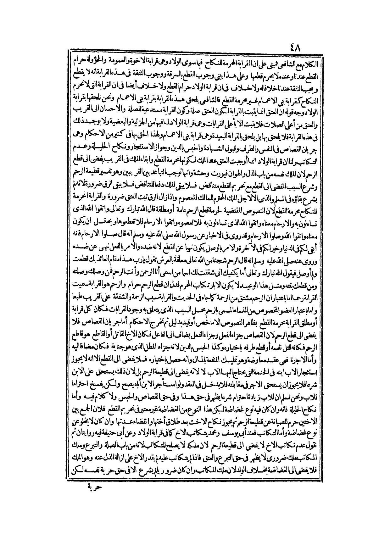 وَرُوِيَ عَنْهُ - صَلَّى اللَّهُ عَلَيْهِ وَسَلَّمَ - أَنَّهُ قَالَ «الرَّحِمُ شُجْنَةٌ مِنْ اللَّهِ تَعَالَى مُعَلَّقَةٌ بِالْعَرْشِ تَقُولُ يَا رَبِّ هَذَا مَقَامُ الْعَائِذِ بِكَ قُطِعْتُ وَلَمْ أُوصَلْ فَيَقُولُ اللَّهُ تَبَارَكَ وَتَعَالَى أَمَا يَكْفِيك أَنِّي شَقَقْت لَك اسْمًا مِنْ اسْمِي أَنَا الرَّحْمَنُ وَأَنْتِ الرَّحِمُ فَمَنْ وَصَلَك وَصَلْته وَمِنْ قَطَعَك بَتَتُّهُ» وَمِثْلُ هَذَا الْوَعِيدِ لَا يَكُونُ إلَّا بِارْتِكَابِ الْمُحَرَّمِ فَدَلَّ أَنَّ قَطْعَ الرَّحِمِ حَرَامٌ وَالرَّحِمُ هُوَ الْقَرَابَةُ سُمِّيَتْ الْقَرَابَةُ رَحِمًا إمَّا بِاعْتِبَارِ أَنَّ الرَّحِمَ مُشْتَقٌّ مِنْ الرَّحْمَةِ كَمَا جَاءَ فِي الْحَدِيثِ وَالْقَرَابَةُ سَبَبُ الرَّحْمَةِ وَالشَّفَقَةِ عَلَى الْقَرِيبِ طَبْعًا وَإِمَّا بِاعْتِبَارِ الْعُضْوِ الْمَخْصُوصِ مِنْ النِّسَاءِ الْمُسَمَّى بِالرَّحِمِ مَحَلُّ السَّبَبِ الَّذِي يَتَعَلَّقُ بِهِ وُجُودُ الْقَرَابَاتِ فَكَانَ كُلُّ قَرَابَةٍ أَوْ مُطْلَقُ الْقَرَابَةِ مُحَرَّمَةَ الْقَطْعِ بِظَاهِرِ النُّصُوصِ إلَّا مَا خُصَّ أَوْ قُيِّدَ بِدَلِيلٍ ثُمَّ نُخْرِجُ الْأَحْكَامَ، أَمَّا جَرَيَانُ الْقِصَاصِ فَلَا يُفْضِي إلَى قَطْعِ الرَّحِمِ؛ لِأَنَّ الْقِصَاصَ جَزَاءُ الْفِعْلِ، وَجَزَاءُ الْفِعْلِ يُضَافُ إلَى الْفَاعِلِ فَكَانَ الْأَخُ الْقَاتِلُ أَوْ الْقَاطِعُ هُوَ قَاطَعَ الرَّحِمِ فَكَأَنَّهُ قَتَلَ نَفْسَهُ أَوْ قَطَعَ طَرَفَهُ بِاخْتِيَارِهِ، وَكَذَا الْحَبْسُ بِالدَّيْنِ؛ لِأَنَّهُ جَزَاءُ الْمَطْلِ الَّذِي هُوَ جِنَايَةٌ فَكَانَ مُضَافًا إلَيْهِ.