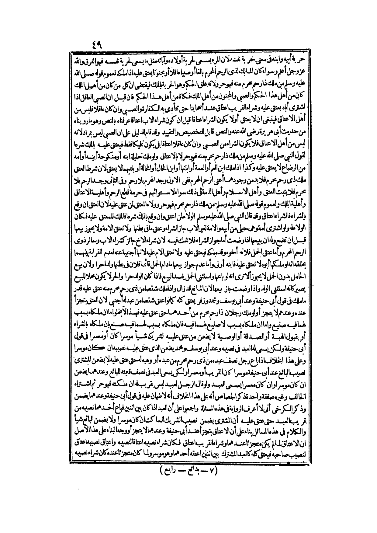 حُرِّيَّةَ أَبِيهِ وَابْنِهِ فِي مَعْنَى حُرِّيَّةِ نَفْسِهِ؛ لِأَنَّ الْمَرْءَ يَسْعَى لِحُرِّيَّةِ أَوْلَادِهِ وَآبَائِهِ مِثْلَ مَا يَسْعَى لِحُرِّيَّةِ نَفْسِهِ فَهُوَ الْفَرْقُ وَاَللَّهُ عَزَّ وَجَلَّ أَعْلَمُ وَسَوَاءٌ كَانَ الْمَالِكُ لِذِي الرَّحِمِ الْمَحْرَمِ بَالِغًا أَوْ صَبِيًّا عَاقِلًا أَوْ مَجْنُونًا؛ يَعْتِقُ عَلَيْهِ إذَا مَلَكَهُ لِعُمُومِ قَوْلِهِ - صَلَّى اللَّهُ عَلَيْهِ وَسَلَّمَ - «مَنْ مَلَكَ ذَا رَحِمٍ مَحْرَمٍ مِنْهُ فَهُوَ حُرٌّ» وَلِأَنَّهُ عَلَّقَ الْحُكْمَ وَهُوَ الْحُرِّيَّةُ بِالْمِلْكِ فَيَقْتَضِي أَنَّ كُلَّ مَنْ كَانَ مِنْ أَهْلِ الْمِلْكِ؛ كَانَ مِنْ أَهْلِ هَذَا الْحُكْمِ وَالصَّبِيُّ وَالْمَجْنُونُ مِنْ أَهْلِ الْمِلْكِ فَكَانَا مِنْ أَهْلِ هَذَا الْحُكْمِ فَإِنْ قِيلَ: إنَّ الصَّبِيَّ الْعَاقِلَ إذَا اشْتَرَى أَبَاهُ يَعْتِقُ عَلَيْهِ وَشِرَاءُ الْقَرِيبِ إعْتَاقٌ عِنْدَ أَصْحَابِنَا حَتَّى تَتَأَدَّى بِهِ الْكَفَّارَةُ وَالصَّبِيُّ وَإِنْ كَانَ عَاقِلًا فَلَيْسَ مِنْ أَهْلِ الْإِعْتَاقِ فَيَنْبَغِي أَنْ لَا يَعْتِقَ أَوْ لَا يَكُونَ الشِّرَاءُ إعْتَاقًا قِيلَ: إنَّ كَوْنَ شِرَاءِ الْأَبِ إعْتَاقًا عَرَفْنَاهُ بِالنَّصِّ وَهُوَ مَا رَوَيْنَاهُ مِنْ حَدِيثِ أَبِي هُرَيْرَةَ - رَضِيَ اللَّهُ عَنْهُ - وَالنَّصُّ قَابِلٌ لِلتَّخْصِيصِ وَالتَّقْيِيدِ وَقَدْ قَامَ الدَّلِيلُ عَلَى أَنَّ الصَّبِيَّ لَيْسَ بِمُرَادٍ؛ لِأَنَّهُ لَيْسَ مِنْ أَهْلِ الْإِعْتَاقِ فَلَا يَكُونُ الشِّرَاءُ مِنْ الصَّبِيِّ وَإِنْ كَانَ عَاقِلًا إعْتَاقًا بَلْ يَكُونُ تَمْلِيكًا فَقَطْ فَيَعْتِقُ عَلَيْهِ بِالْمِلْكِ شَرْعًا لِقَوْلِ النَّبِيِّ - صَلَّى اللَّهُ عَلَيْهِ وَسَلَّمَ - «مَنْ مَلَكَ ذَا رَحِمٍ مَحْرَمٍ مِنْهُ فَهُوَ حُرٌّ» لَا بِالْإِعْتَاقِ.