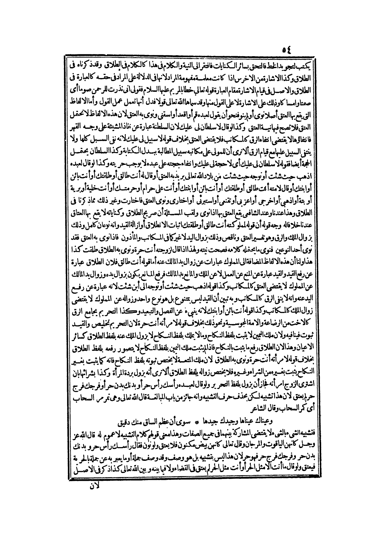 فَتَشْبِيهُ الشَّيْءِ بِالشَّيْءِ لَا يَقْتَضِي الْمُشَارَكَةَ بَيْنَهُمَا فِي جَمِيعِ الصِّفَاتِ وَهَذَا مَعْنَى قَوْلِهِمْ: كَلَامُ التَّشْبِيهِ لَا عُمُومَ لَهُ قَالَ اللَّهُ عَزَّ وَجَلَّ {كَأَنَّهُنَّ الْيَاقُوتُ وَالْمَرْجَانُ} [الرحمن: 58] وَقَالَ تَعَالَى {كَأَنَّهُنَّ بَيْضٌ مَكْنُونٌ} [الصافات: 49] فَلَا يَعْتِقُ، وَلَوْ نَوَّنَ فَقَالَ: رَأْسُك رَأْسٌ حُرٌّ وَبَدَنُك بَدَنٌ حُرٌّ وَفَرْجُك فَرْجٌ حُرٌّ فَهُوَ حُرٌّ؛ هَذَا لَيْسَ بِتَشْبِيهٍ بَلْ هُوَ وَصْفٌ وَقَدْ وُصِفَ جُمْلَةً أَوْ مَا يُعَبَّرُ بِهِ عَنْ جُمْلَةٍ بِالْحُرِّيَّةِ فَيَعْتِقُ، وَلَوْ قَالَ: مَا أَنْتَ إلَّا مِثْلُ الْحُرِّ أَوْ أَنْتَ مِثْلُ الْحُرِّ؛ لَمْ يَعْتِقْ فِي الْقَضَاءِ وَلَا فِيمَا بَيْنَهُ وَبَيْنَ اللَّهِ تَعَالَى كَذَا ذَكَرَ فِي الْأَصْلِ