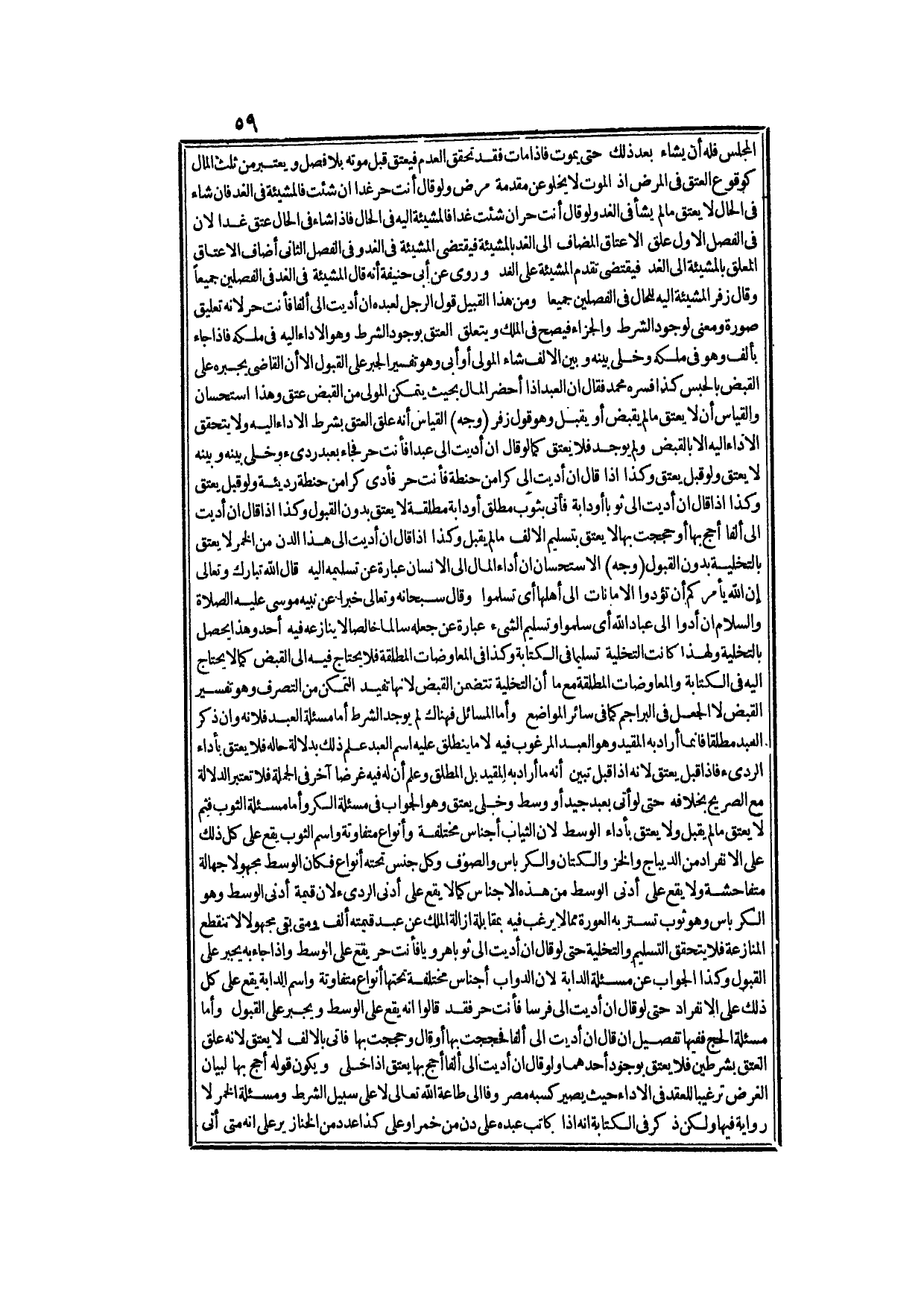الْمَجْلِسِ فَلَهُ أَنْ يَشَاءَ بَعْدَ ذَلِكَ حَتَّى يَمُوتَ فَإِذَا مَاتَ فَقَدْ تَحَقَّقَ الْعَدَمُ فَيَعْتِقُ قَبْلَ مَوْتِهِ بِلَا فَصْلٍ وَيُعْتَبَرُ مِنْ ثُلُثِ الْمَالِ كَوُقُوعِ الْعِتْقِ فِي الْمَرَضِ إذْ الْمَوْتُ لَا يَخْلُو عَنْ مُقَدَّمَةِ مَرَضٍ وَلَوْ قَالَ: أَنْتَ حُرٌّ غَدًا إنْ شِئْت فَالْمَشِيئَةُ فِي الْغَدِ فَإِنْ شَاءَ فِي الْحَالِ لَا يَعْتِقُ مَا لَمْ يَشَأْ فِي الْغَدِ وَلَوْ قَالَ: أَنْتَ حُرٌّ إنْ شِئْت غَدًا فَالْمَشِيئَةُ إلَيْهِ فِي الْحَالِ فَإِذَا شَاءَ فِي الْحَالِ عَتَقَ غَدًا لِأَنَّ فِي الْفَصْلِ الْأَوَّلِ عُلِّقَ الْإِعْتَاقُ الْمُضَافُ إلَى الْغَدِ بِالْمَشِيئَةِ فَيَقْتَضِي الْمَشِيئَةَ فِي الْغَدِ وَفِي الْفَصْلِ الثَّانِي أَضَافَ الْإِعْتَاقَ الْمُعَلَّقَ بِالْمَشِيئَةِ إلَى الْغَدِ فَيَقْتَضِي تَقَدُّمَ الْمَشِيئَةِ عَلَى الْغَدِ.