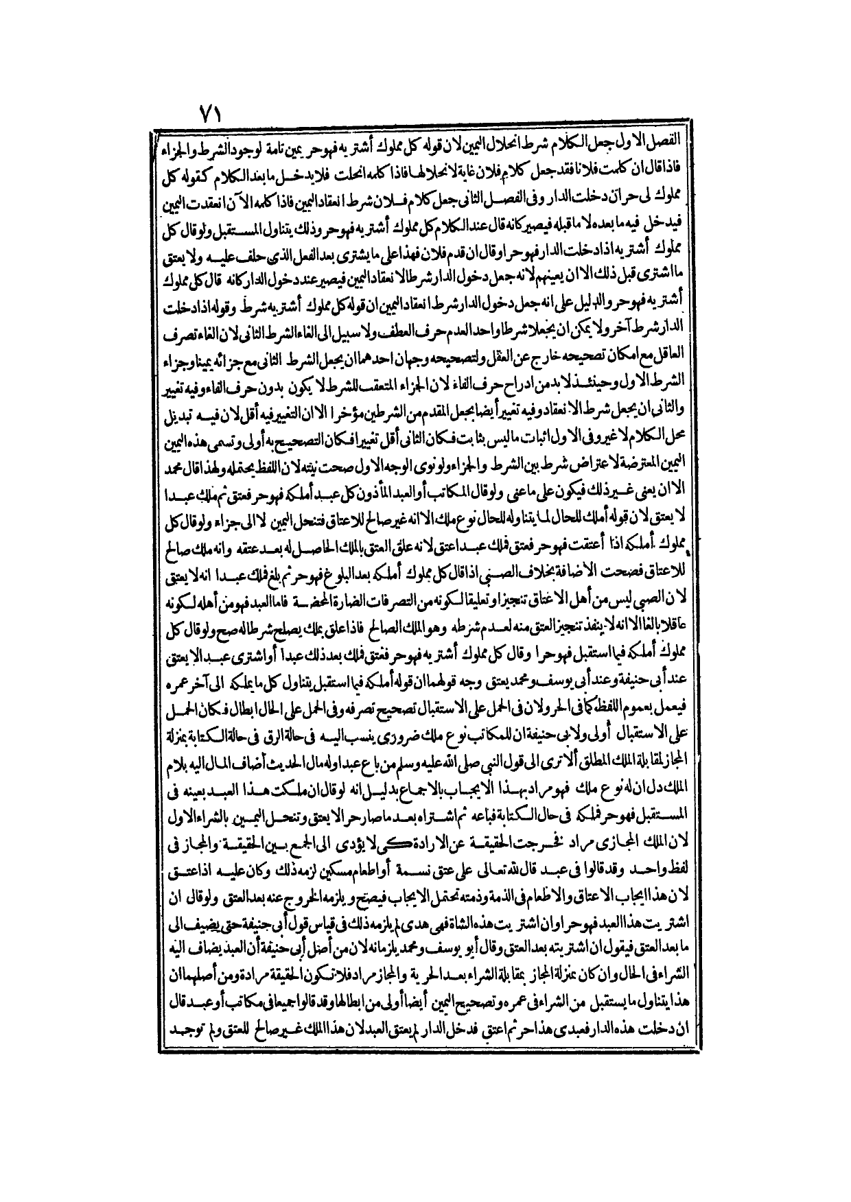 الْفَصْلِ الْأَوَّلِ جَعَلَ الْكَلَامَ شَرْطَ انْحِلَالِ الْيَمِينِ؛ لِأَنَّ قَوْلَهُ: كُلُّ مَمْلُوكٍ أَشْتَرِيهِ فَهُوَ حُرٌّ يَمِينٌ تَامَّةٌ لِوُجُودِ الشَّرْطِ وَالْجَزَاءِ فَإِذَا قَالَ: إنْ كَلَّمْت فُلَانًا فَقَدْ جَعَلَ كَلَامَ فُلَانٍ غَايَةً لِانْحِلَالِهَا فَإِذَا كَلَّمَهُ انْحَلَّتْ فَلَا يَدْخُلُ مَا بَعْدَ الْكَلَامِ كَقَوْلِهِ كُلُّ مَمْلُوكٍ لِي حُرٌّ إنْ دَخَلْت الدَّارَ وَفِي الْفَصْلِ الثَّانِي جَعَلَ كَلَامَ فُلَانٍ شَرْطَ انْعِقَادِ الْيَمِينِ فَإِذَا كَلَّمَهُ الْآنَ انْعَقَدَتْ الْيَمِينُ فَيَدْخُلُ فِيهِ مَا بَعْدَهُ لَا مَا قَبْلَهُ فَيَصِيرُ كَأَنَّهُ قَالَ عِنْدَ الْكَلَامِ: كُلُّ مَمْلُوكٍ أَشْتَرِيهِ فَهُوَ حُرٌّ، وَذَلِكَ يَتَنَاوَلُ الْمُسْتَقْبَلَ وَلَوْ قَالَ: كُلُّ مَمْلُوكٍ أَشْتَرِيه إذَا دَخَلْت الدَّارَ فَهُوَ حُرٌّ أَوْ قَالَ: إنْ قَدِمَ فُلَانٌ فَهَذَا عَلَى مَا يَشْتَرِي بَعْدَ الْفِعْلِ الَّذِي حَلَفَ عَلَيْهِ وَلَا يَعْتِقُ مَا اشْتَرَى قَبْلَ ذَلِكَ إلَّا أَنْ يُعَيِّنَهُمْ؛ لِأَنَّهُ جَعَلَ دُخُولَ الدَّارِ شَرْطًا لِانْعِقَادِ الْيَمِينِ فَيَصِيرُ عَنْدَ دُخُولِ الدَّارِ كَأَنَّهُ قَالَ: كُلُّ مَمْلُوكٌ أَشْتَرِيهِ فَهُوَ حُرٌّ، وَالدَّلِيلُ عَلَى أَنَّهُ جَعَلَ دُخُولَ الدَّارِ شَرْطَ انْعِقَادِ الْيَمِينِ أَنَّ قَوْلَهُ: كُلُّ مَمْلُوكٍ أَشْتَرِيهِ شَرْطٌ، وَقَوْلُهُ: إذَا دَخَلْت الدَّارَ شَرْطٌ آخَرُ وَلَا يُمْكِنُ أَنْ يُجْعَلَا شَرْطًا وَاحِدًا لِعَدَمِ حَرْفِ الْعَطْفِ وَلَا سَبِيلَ إلَى إلْغَاءِ الشَّرْطِ الثَّانِي؛ لِأَنَّ إلْغَاءَ تَصَرُّفِ الْعَاقِلِ مَعَ إمْكَانِ تَصْحِيحِهِ خَارِجٌ عَنْ الْعَقْلِ وَلِتَصْحِيحِهِ وَجْهَانِ: أَحَدُهُمَا: أَنْ يُجْعَلَ الشَّرْطُ الثَّانِي مَعَ جَزَائِهِ يَمِينًا وَجَزَاءُ الشَّرْطِ الْأَوَّلِ وَحِينَئِذٍ لَا بُدَّ مِنْ إدْرَاجِ حَرْفِ الْفَاءِ؛ لِأَنَّ الْجَزَاءَ الْمُتَعَقِّبَ لِلشَّرْطِ لَا يَكُونُ بِدُونِ حَرْفِ الْفَاءِ وَفِيهِ تَغْيِيرٌ، وَالثَّانِي: أَنْ يُجْعَلَ شَرْطُ الِانْعِقَادِ وَفِيهِ تَغْيِيرٌ أَيْضًا بِجَعْلِ الْمُقَدَّمِ مِنْ الشَّرْطَيْنِ مُؤَخَّرًا إلَّا أَنَّ التَّغْيِيرَ فِيهِ أَقَلُّ؛ لِأَنَّ فِيهِ تَبْدِيلَ مَحَلِّ الْكَلَامِ لَا غَيْرُ وَفِي الْأَوَّلِ إثْبَاتُ مَا لَيْسَ بِثَابِتٍ فَكَانَ الثَّانِي أَقَلَّ تَغْيِيرًا فَكَانَ التَّصْحِيحُ بِهِ أَوْلَى وَتُسَمَّى هَذِهِ الْيَمِينُ الْيَمِينَ الْمُعْتَرِضَةَ لِاعْتِرَاضِ شَرْطٍ بَيْنَ الشَّرْطِ وَالْجَزَاءِ، وَلَوْ نَوَى الْوَجْهَ الْأَوَّلَ صَحَّتْ نِيَّتُهُ؛ لِأَنَّ اللَّفْظَ يَحْتَمِلُهُ وَلِهَذَا قَالَ مُحَمَّدٌ: إلَّا أَنْ يَعْنِيَ غَيْرَ ذَلِكَ فَيَكُونَ عَلَى مَا عَنَى.
