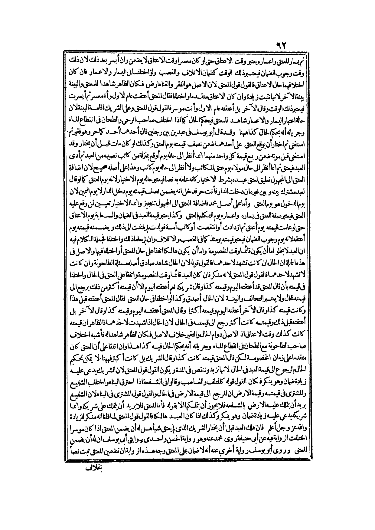 ثُمَّ يَسَارُ الْمُعْتِقُ وَإِعْسَارُهُ يُعْتَبَرُ وَقْتَ الْإِعْتَاقِ حَتَّى لَوْ كَانَ مُعْسِرًا وَقْتَ الْإِعْتَاقِ لَا يَضْمَنُ وَإِنْ أَيْسَرَ بَعْدَ ذَلِكَ؛ لِأَنَّ ذَلِكَ وَقْتُ وُجُوبِ الضَّمَانِ فَيُعْتَبَرُ ذَلِكَ الْوَقْتُ كَضَمَانِ الْإِتْلَافِ وَالْغَصْبِ، وَلَوْ اخْتَلَفَا فِي الْيَسَارِ وَالْإِعْسَارِ فَإِنْ كَانَ اخْتِلَافُهُمَا حَالَ الْإِعْتَاقِ، فَالْقَوْلُ قَوْلُ الْمُعْتِقِ؛ لِأَنَّ الْأَصْلَ هُوَ الْفَقْرُ وَالْغِنَى عَارِضٌ فَكَانَ الظَّاهِرُ شَاهِدًا لِلْمُعْتِقِ وَالْبَيِّنَةُ بَيِّنَةُ الْآخَرِ؛ لِأَنَّهَا تُثْبِتُ زِيَادَةً، وَإِنْ كَانَ الْإِعْتَاقُ مُتَقَدِّمًا وَاخْتَلَفَا فَقَالَ الْمُعْتِقُ: أَعْتَقْتُ عَامَ الْأَوَّلِ وَأَنَا مُعْسِرٌ ثُمَّ أَيْسَرْتُ، فَيُعْتَبَرُ ذَلِكَ الْوَقْتُ، وَقَالَ الْآخَرُ: بَلْ أَعْتَقْتُهُ عَامَ الْأَوَّلِ وَأَنْتَ مُوسِرٌ فَالْقَوْلُ قَوْلُ الْمُعْتِقِ وَعَلَى الشَّرِيكِ إقَامَةُ الْبَيِّنَةِ؛ لِأَنَّ حَالَةَ اعْتِبَارِ الْيَسَارِ وَالْإِعْسَارِ شَاهِدٌ لِلْمُعْتِقِ فَيَحْكُمُ الْحَالُ، كَمَا إذَا اخْتَلَفَ صَاحِبُ الرَّحَى وَالطَّحَّانُ فِي انْقِطَاعِ الْمَاءِ وَجَرَيَانِهِ، أَنَّهُ يَحْكُمُ الْحَالُ، كَذَا هَهُنَا.