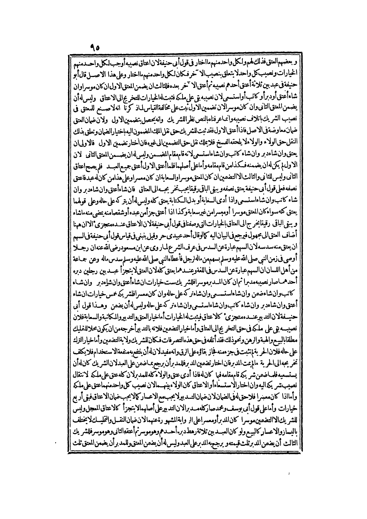 وَأَمَّا عَلَى أَصْلِهِمَا فَلَمَّا أَعْتَقَ الْأَوَّلُ، أُعْتِقَ جَمِيعُ الْعَبْدِ فَلَمْ يَصِحَّ إعْتَاقُ الثَّانِي وَلَيْسَ لِلثَّانِي وَالثَّالِثِ إلَّا التَّضْمِينُ إنْ كَانَ الْمُعْتِقُ مُوسِرًا وَالسِّعَايَةُ إنْ كَانَ مُعْسِرًا، وَعَلَى هَذَا مَنْ كَانَ لَهُ عَبْدٌ فَأَعْتَقَ نِصْفَهُ فَعَلَى قَوْلِ أَبِي حَنِيفَةَ: يُعْتِقُ نِصْفَهُ وَيَبْقَى الْبَاقِي رَقِيقًا، يَجِبُ تَخْرِيجُهُ إلَى الْعَتَاقِ فَإِنْ شَاءَ أَعْتَقَ وَإِنْ شَاءَ دَبَّرَ وَإِنْ شَاءَ كَاتَبَ وَإِنْ شَاءَ اسْتَسْعَى، وَإِذَا أَدَّى السِّعَايَةَ أَوْ بَدَلَ الْكِتَابَةِ يُعْتِقُ كُلَّهُ وَلَيْسَ لَهُ أَنْ يَتْرُكَهُ عَلَى حَالِهِ، وَعَلَى قَوْلِهِمَا: يُعْتَقُ كُلُّهُ سَوَاءٌ كَانَ الْمُعْتِقُ مُوسِرًا أَوْ مُعْسِرًا مِنْ غَيْرِ سِعَايَةٍ، وَكَذَا إذَا أَعْتَقَ جُزْءًا مِنْ عَبْدِهِ أَوْ شِقْصًا مِنْهُ، يَمْضِي مِنْهُ مَا شَاءَ وَيَبْقَى الْبَاقِي رَقِيقًا يَخْرُجُ إلَى الْعَتَاقِ بِالْخِيَارَاتِ الَّتِي وَصَفْنَا فِي قَوْلِ أَبِي حَنِيفَةَ؛ لِأَنَّ الْإِعْتَاقَ عِنْدَهُ مُتَجَزِّئٌ، إلَّا أَنَّ هَهُنَا أَضَافَ الْعِتْقَ إلَى مَجْهُولٍ فَيَرْجِعُ فِي الْبَيَانِ إلَيْهِ، كَمَا لَوْ قَالَ: أَحَدُ عَبِيدِي حُرٌّ، وَقِيلَ: يَنْبَغِي فِي قِيَاسِ قَوْلِ أَبِي حَنِيفَةَ فِي السَّهْمِ أَنْ يُعْتَقَ مِنْهُ سُدُسُهُ؛ لِأَنَّ السَّهْمَ عِبَارَةٌ عَنْ السُّدُسِ فِي عُرْفِ الشَّرْعِ؛ لِمَا رُوِيَ عَنْ ابْنِ مَسْعُودٍ - رَضِيَ اللَّهُ عَنْهُ - أَنَّ «رَجُلًا أَوْصَى فِي زَمَنِ النَّبِيِّ - صَلَّى اللَّهُ عَلَيْهِ وَسَلَّمَ - بِسَهْمٍ مِنْ مَالِهِ لِرَجُلٍ فَأَعْطَاهُ النَّبِيُّ - صَلَّى اللَّهُ عَلَيْهِ وَسَلَّمَ - سُدُسَ مَالِهِ» جَمَاعَةٍ مِنْ أَهْلِ اللِّسَانِ أَنَّ السَّهْمَ عِبَارَةٌ عَنْ السُّدُسِ فِي اللُّغَةِ، وَعِنْدَهُمَا يُعْتَقُ كُلُّهُ؛ لِأَنَّ الْعِتْقَ لَا يَتَجَزَّأُ عَبْدٌ بَيْنَ رَجُلَيْنِ دَبَّرَهُ أَحَدُهُمَا صَارَ نَصِيبُهُ مُدَبَّرًا.