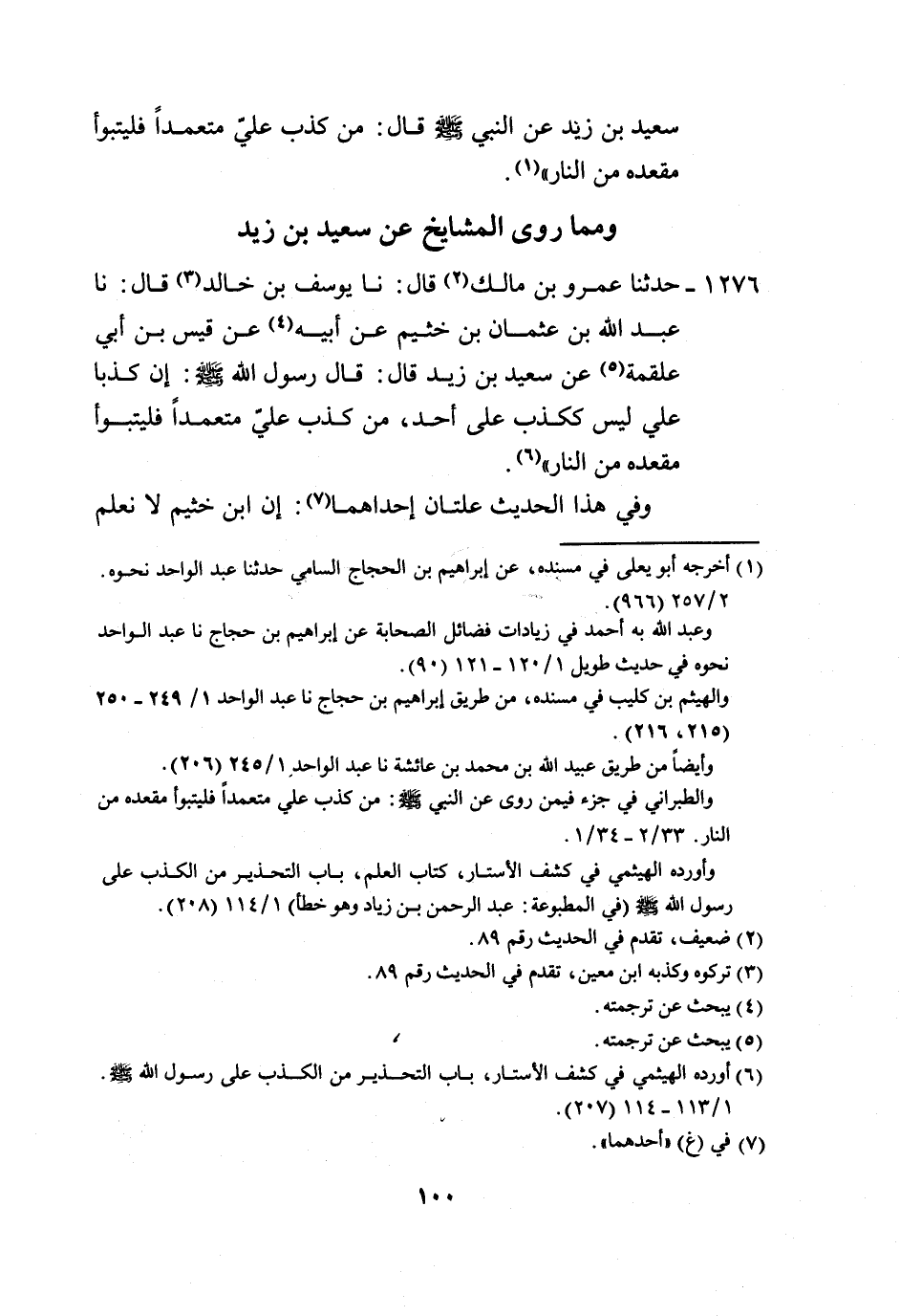 1276 - حَدَّثَنَا عَمْرُو بْنُ مَالِكٍ، قَالَ: نَا يُوسُفُ بْنُ خَالِدٍ، قَالَ: نَا عَبْدُ اللَّهِ بْنُ عُثْمَانَ بْنِ خُثَيْمٍ، عَنْ أَبِيهِ، عَنْ قَيْسِ بْنِ أَبِي عَلْقَمَةَ، عَنْ سَعِيدِ بْنِ زَيْدٍ، قَالَ: قَالَ رَسُولُ اللَّهِ صَلَّى اللهُ عَلَيْهِ وَسَلَّمَ: «§إِنَّ كَذِبًا عَلَيَّ لَيْسَ كَكَذِبِ عَلَى أَحَدٍ، مَنْ كَذَبَ عَلَيَّ مُتَعَمِّدًا، فَلْيَتَبَوَّأْ مَقْعَدَهُ مِنَ النَّارِ» وَفِي هَذَا الْحَدِيثِ عِلَّتَانِ: إِحْدَاهُمَا أَنَّ ابْنَ خُثَيْمٍ لَا نَعْلَمُ -[101]- رَوَى عَنْ أَبِيهِ غَيْرَ هَذَا الْحَدِيثَ، وَقَيْسُ بْنُ أَبِي عَلْقَمَةَ لَا نَعْلَمُ لَهُ ذِكْرًا إِلَّا فِي هَذَا الْحَدِيثِ