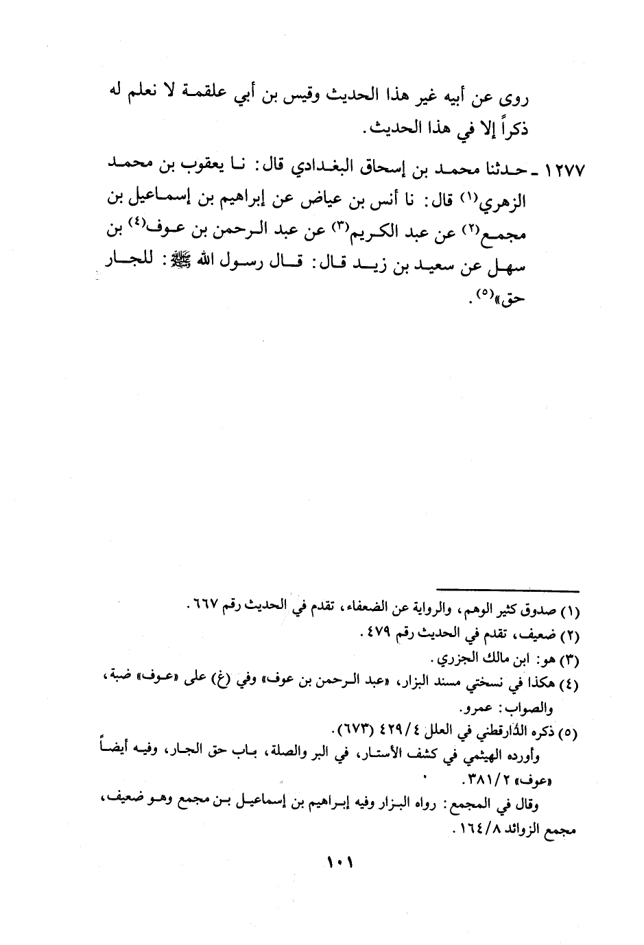 1277 - حَدَّثَنَا مُحَمَّدُ بْنُ إِسْحَاقَ الْبَغْدَادِيُّ، قَالَ: نَا يَعْقُوبُ بْنُ مُحَمَّدٍ الزُّهْرِيُّ، قَالَ: نَا أَنَسُ بْنُ عِيَاضٍ، عَنْ إِبْرَاهِيمَ بْنِ إِسْمَاعِيلَ بْنِ مُجَمِّعٍ، عَنْ عَبْدِ الْكَرِيمِ، عَنْ عَبْدِ الرَّحْمَنِ بْنِ عَوْفِ بْنِ سَهْلٍ، عَنْ سَعِيدِ بْنِ زَيْدٍ، قَالَ: قَالَ رَسُولُ اللَّهِ صَلَّى اللهُ عَلَيْهِ وَسَلَّمَ: «§لِلْجَارِ حَقٌّ»
