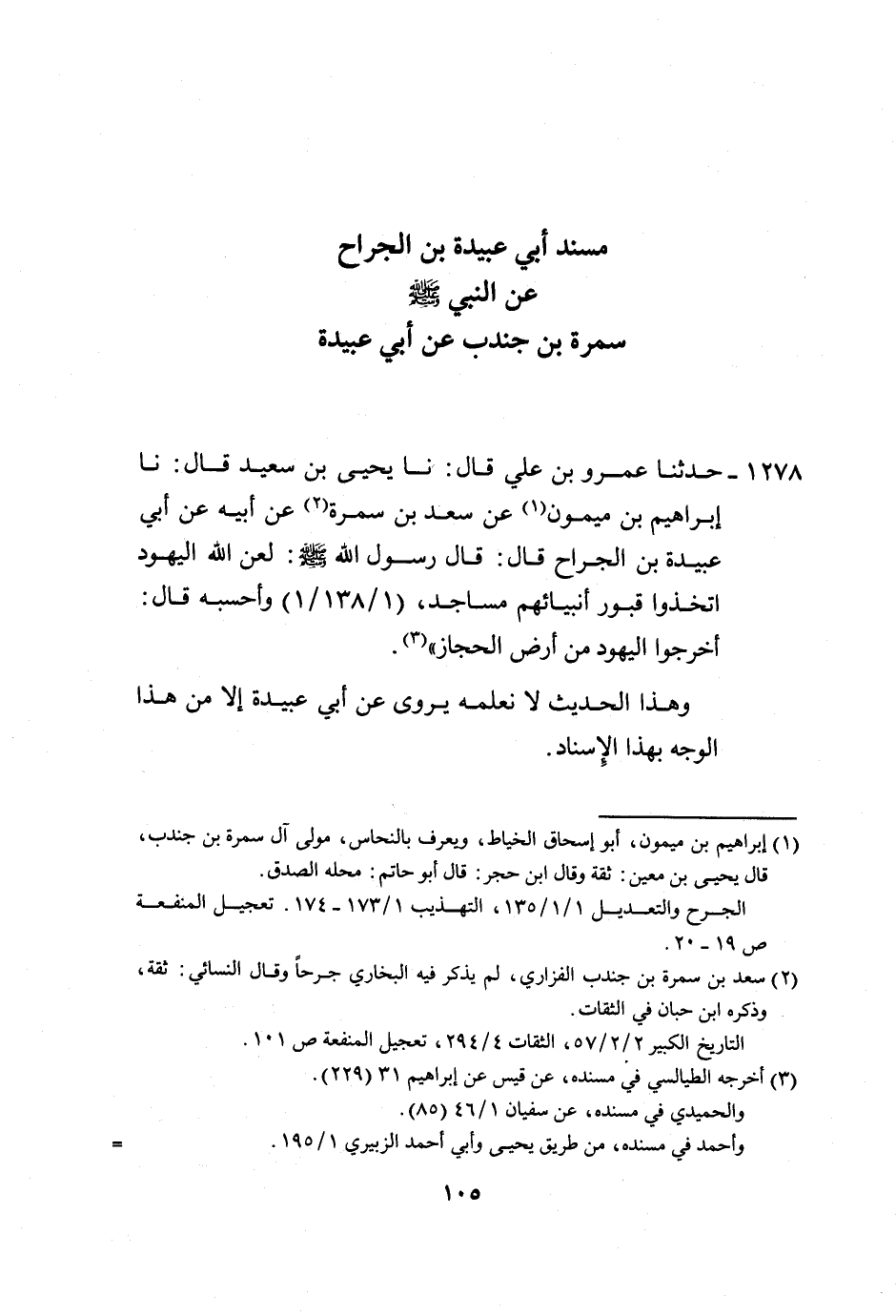 1278 - حَدَّثَنَا عَمْرُو بْنُ عَلِيٍّ، قَالَ: نَا يَحْيَى بْنُ سَعِيدٍ، قَالَ: نَا إِبْرَاهِيمُ بْنُ مَيْمُونٍ، عَنْ سَعْدِ بْنِ سَمُرَةَ، عَنْ أَبِيهِ، عَنْ أَبِي عُبَيْدَةَ بْنِ الْجَرَّاحِ، قَالَ: قَالَ رَسُولُ اللَّهِ صَلَّى اللهُ عَلَيْهِ وَسَلَّمَ: «§لَعَنَ اللَّهُ الْيَهُودَ، اتَّخَذُوا قُبُورَ أَنْبِيَائِهِمْ مَسَاجِدَ»