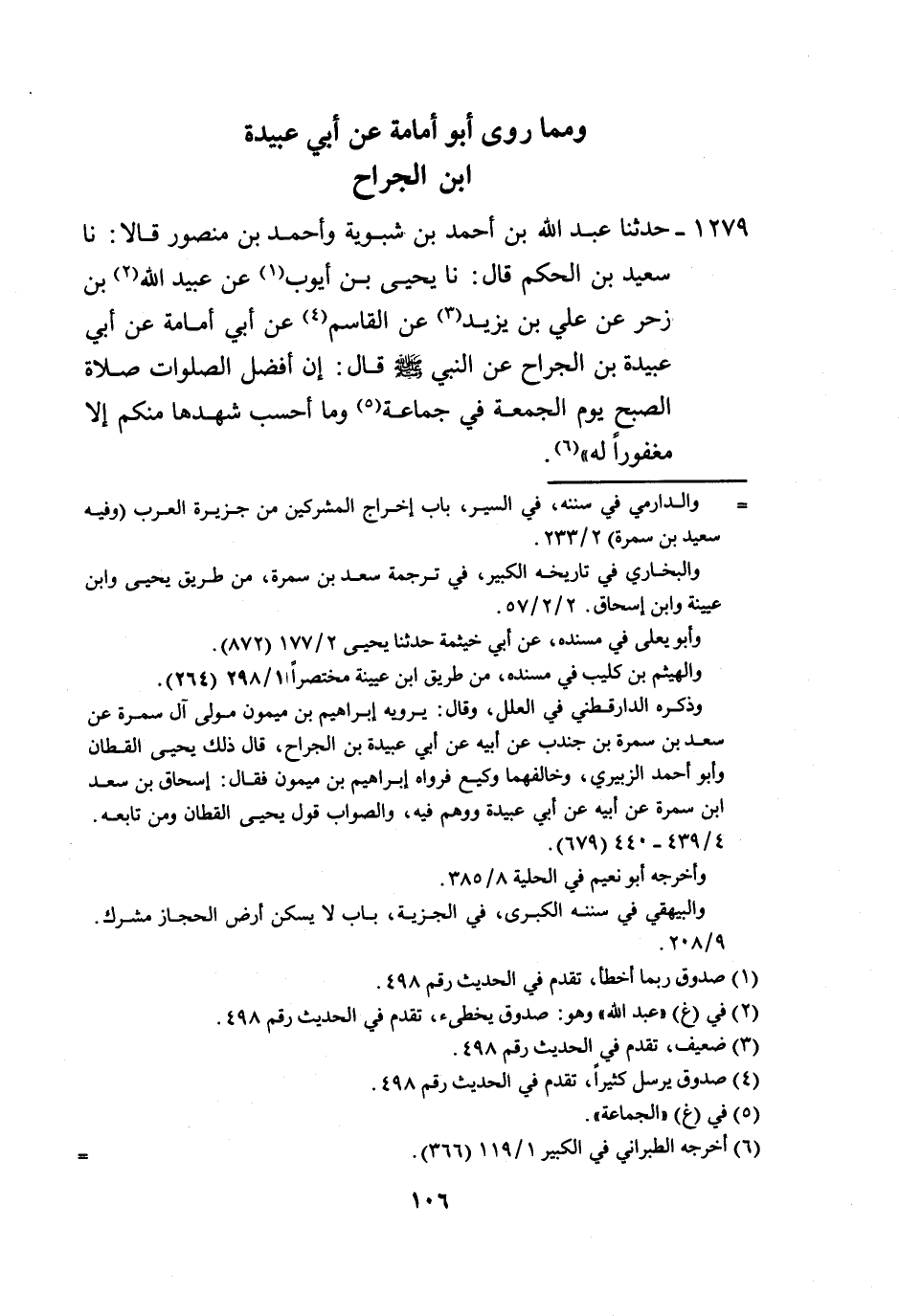 1279 - حَدَّثَنَا عَبْدُ اللَّهِ بْنُ أَحْمَدَ بْنِ شَبُّوَيْهِ، وَأَحْمَدُ بْنُ مَنْصُورٍ، قَالَا: نَا سَعِيدُ بْنُ الْحَكَمِ، قَالَ: نَا يَحْيَى بْنُ أَيُّوبَ، عَنْ عُبَيْدِ اللَّهِ بْنِ زَحْرٍ، عَنْ عَلِيِّ بْنِ يَزِيدَ، عَنِ الْقَاسِمِ، عَنْ أَبِي أُمَامَةَ، عَنْ أَبِي عُبَيْدَةَ بْنِ الْجَرَّاحِ، عَنِ النَّبِيِّ صَلَّى اللهُ عَلَيْهِ وَسَلَّمَ، قَالَ: «إِنَّ §أَفْضَلَ الصَّلَوَاتِ صَلَاةُ الصُّبْحِ يَوْمَ الْجُمُعَةِ فِي جَمَاعَةٍ، وَمَا أَحْسَبُ شَهِدَهَا مِنْكُمْ إِلَّا مَغْفُورًا لَهُ» -[107]- وَلَا نَعْلَمُ رَوَى هَذَا الْكَلَامَ إِلَّا أَبُو عُبَيْدَةَ بْنُ الْجَرَّاحِ بِهَذَا الْإِسْنَادِ