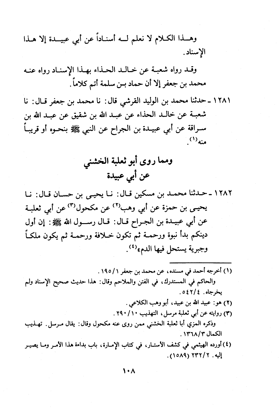 1282 - حَدَّثَنَا مُحَمَّدُ بْنُ مِسْكِينٍ، قَالَ: نَا يَحْيَى بْنُ حَسَّانَ، قَالَ: نَا يَحْيَى بْنُ حَمْزَةَ، عَنْ أَبِي وَهْبٍ، عَنْ مَكْحُولٍ، عَنْ أَبِي ثَعْلَبَةَ، عَنْ أَبِي عُبَيْدَةَ بْنِ الْجَرَّاحِ، قَالَ: قَالَ رَسُولُ اللَّهِ صَلَّى اللهُ عَلَيْهِ وَسَلَّمَ: «إِنَّ §أَوَّلَ دِينِكُمْ بَدَأُ نُبُوَّةٍ وَرَحْمَةٍ، ثُمَّ تَكُونُ خِلَافَةٌ وَرَحْمَةٌ، ثُمَّ يَكُونُ مُلْكًا وَجَبْرِيَّةً، يُسْتَحَلُّ فِيهَا الدَّمُ» -[109]-،