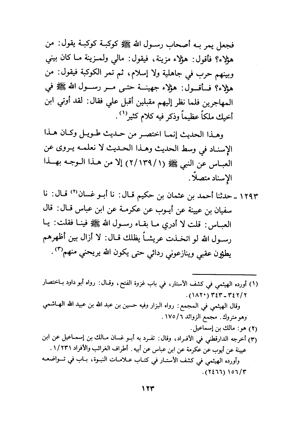 1293 - حَدَّثَنَا أَحْمَدُ بْنُ عُثْمَانَ بْنِ حَكِيمٍ، قَالَ: نَا أَبُو غَسَّانَ، قَالَ: نَا سُفْيَانُ بْنُ عُيَيْنَةَ، عَنْ أَيُّوبَ، عَنْ عِكْرِمَةَ، عَنِ ابْنِ عَبَّاسٍ، قَالَ: قَالَ الْعَبَّاسُ، قُلْتُ: لَا أَدْرِي مَا بَقَاءُ رَسُولِ اللَّهِ صَلَّى اللهُ عَلَيْهِ وَسَلَّمَ فِينَا، فَقُلْتُ: يَا رَسُولَ اللَّهِ لَوِ اتَّخَذْتَ عَرِيشًا يُظِلُّكَ، قَالَ: «§لَا أَزَالُ بَيْنَ أَظْهُرِهِمْ يَطَؤُونَ عَقِبِي، وَيُنَازِعُونِي رِدَائِي حَتَّى يَكُونَ اللَّهُ يُرِيحُنِي مِنْهُمْ» -[124]-،