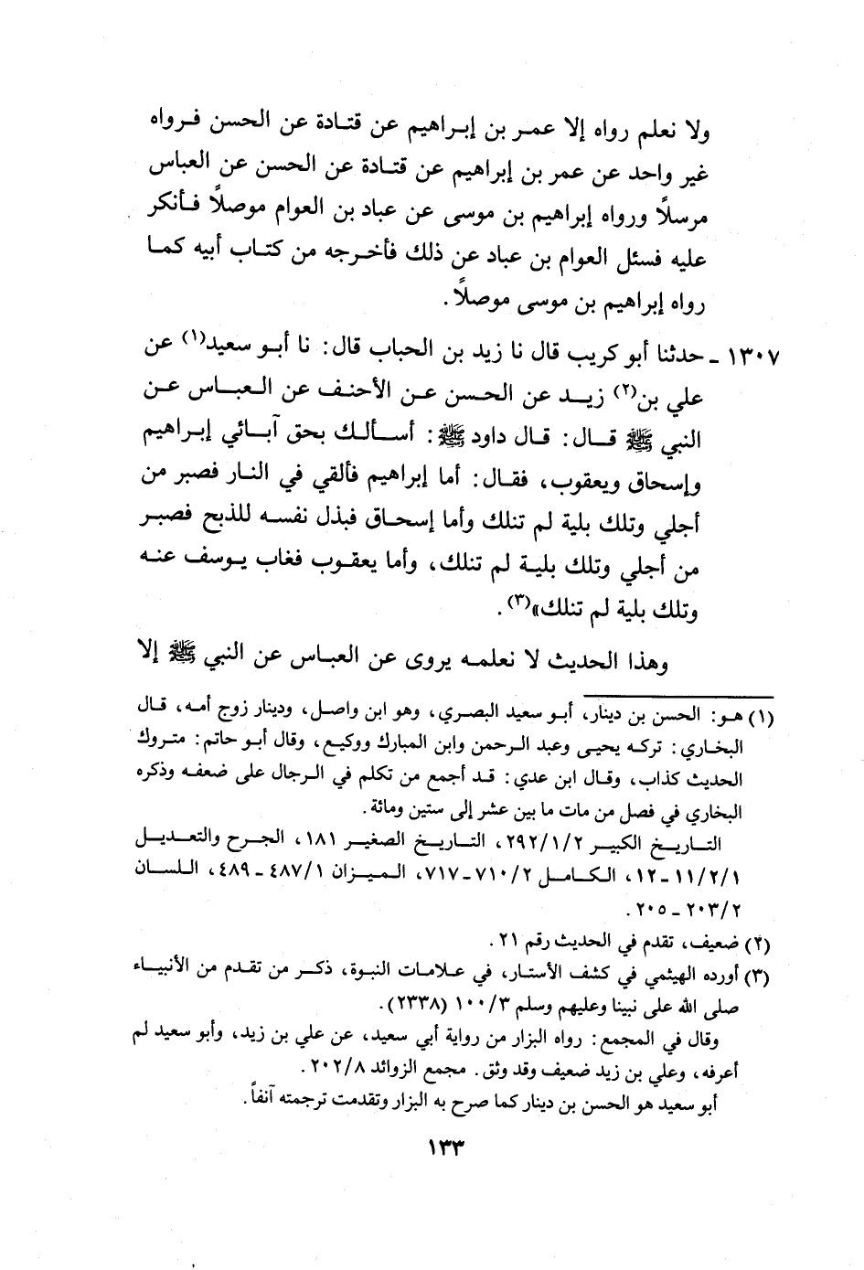 1307 - حَدَّثَنَا أَبُو كُرَيْبٍ، قَالَ: نَا زَيْدُ بْنُ الْحُبَابِ، قَالَ: نَا أَبُو سَعِيدٍ، عَنْ عَلِيِّ بْنِ زَيْدٍ، عَنِ الْحَسَنِ، عَنِ الْأَحْنَفِ، عَنِ الْعَبَّاسِ، عَنِ النَّبِيِّ صَلَّى اللهُ عَلَيْهِ وَسَلَّمَ، قَالَ: " §قَالَ دَاوُدُ صَلَّى اللهُ عَلَيْهِ وَسَلَّمَ، أَسْأَلُكَ بِحَقِّ آبَائِي إِبْرَاهِيمَ وَإِسْحَاقَ، وَيَعْقُوبَ، فَقَالَ: أَمَّا إِبْرَاهِيمُ فَأُلْقِيَ فِي النَّارِ فَصَبَرَ مِنْ أَجْلِي وَتِلْكَ بَلِيَّةٌ لَمْ تَنَلْكَ، وَأَمَّا إِسْحَاقُ فَبَذَلَ نَفْسَهُ لِلذَّبْحِ فَصَبَرَ مِنْ أَجْلِي، وَتِلْكَ بَلِيَّةٌ لَمْ تَنَلْكَ، وَأَمَّا يَعْقُوبُ فَغَابَ يُوسُفُ عَنْهُ، وَتِلْكَ بَلِيَّةٌ لَمْ تَنَلْكَ " وَهَذَا الْحَدِيثُ لَا نَعْلَمُهُ يُرْوَى عَنِ الْعَبَّاسِ، عَنِ النَّبِيِّ صَلَّى اللهُ عَلَيْهِ وَسَلَّمَ إِلَّا مِنْ حَدِيثِ أَبِي سَعِيدٍ، عَنْ عَلِيِّ بْنِ زَيْدٍ، وَأَبُو سَعِيدٍ، هَذَا هُوَ الْحَسَنُ بْنُ دِينَارٍ، وَهُوَ لَيْسَ بِالْقَوِيِّ فِي الْحَدِيثِ، وَقَدْ رَوَى هَذَا الْحَدِيثَ حَمَّادُ بْنُ سَلَمَةَ، عَنْ عَلِيِّ بْنِ زَيْدٍ، عَنِ الْحَسَنِ، عَنِ الْأَحْنَفِ بْنِ قَيْسٍ، عَنِ النَّبِيِّ صَلَّى اللهُ عَلَيْهِ وَسَلَّمَ مُرْسَلًا، وَلَمْ يَقُلْ عَنِ الْعَبَّاسِ، وَإِنَّمَا ذَكَرْنَا هَذَا الْحَدِيثَ، وَإِنْ كَانَ الْحَسَنُ لَيِّنَ الْحَدِيثِ، لِنُبَيِّنَ أَنَّهُ رَفَعَهُ، وَأَنَّ الْحَدِيثَ لَهُ أَصْلٌ مِنْ حَدِيثِ حَمَّادِ بْنِ سَلَمَةَ