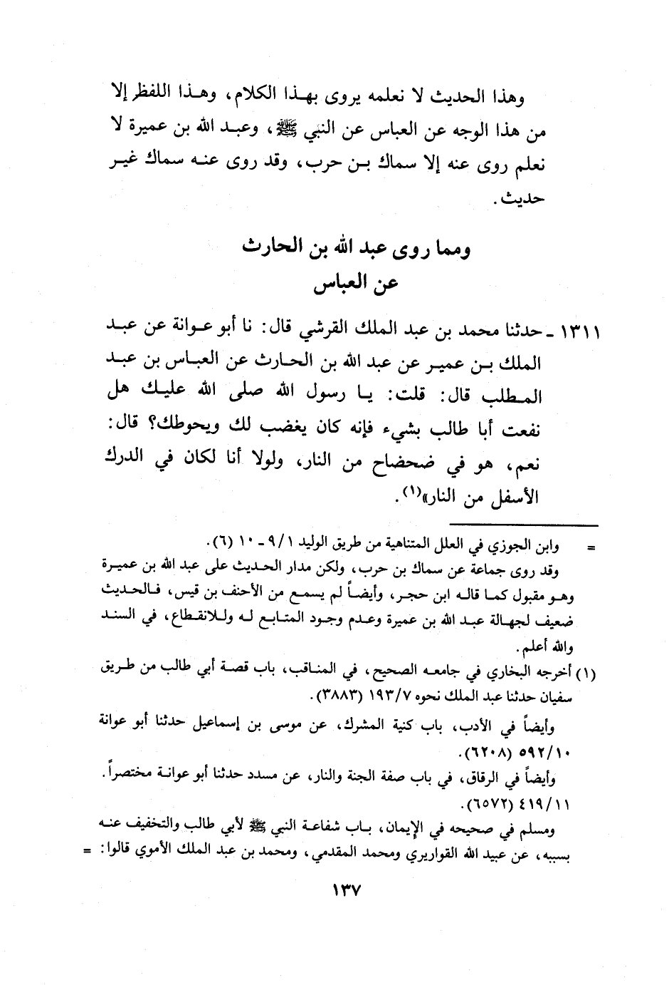 1311 - حَدَّثَنَا مُحَمَّدُ بْنُ عَبْدِ الْمَلِكِ الْقُرَشِيُّ، قَالَ: نا أَبُو عَوَانَةَ، عَنْ عَبْدِ الْمَلِكِ بْنِ عُمَيْرٍ، عَنْ عَبْدِ اللَّهِ بْنِ الْحَارِثِ، عَنِ الْعَبَّاسِ بْنِ عَبْدِ الْمُطَّلِبِ، قَالَ: قُلْتُ يَا رَسُولَ اللَّهِ صَلَّى اللَّهُ عَلَيْكَ، §هَلْ نَفَعْتَ أَبَا طَالِبٍ بِشَيْءٍ، فَإِنَّهُ كَانَ يَغْضَبُ لَكَ، وَيَحُوطُكَ، قَالَ: «نَعَمْ، هُوَ فِي ضَحْضَاحٍ مِنَ النَّارِ، وَلَوْلَا أَنَا لَكَانَ فِي الدَّرْكِ الْأَسْفَلِ مِنَ النَّارِ» -[138]- وَهَذَا الْحَدِيثُ لَا نَعْلَمُهُ يُرْوَى عَنِ الْعَبَّاسِ، عَنِ النَّبِيِّ صَلَّى اللهُ عَلَيْهِ وَسَلَّمَ إِلَّا مِنْ حَدِيثِ عَبْدِ الْمَلِكِ، عَنْ عَبْدِ اللَّهِ بْنِ الْحَارِثِ، عَنِ الْعَبَّاسِ وَقَدْ رُوِيَ عَنِ النَّبِيِّ صَلَّى اللهُ عَلَيْهِ وَسَلَّمَ مِنْ وُجُوهٍ، فَرَوَى ذَلِكَ ابْنُ عَبَّاسٍ، وَأَبُو سَعِيدٍ الْخُدْرِيُّ، وَأَبُو هُرَيْرَةَ، وَغَيْرُهُمْ، وَأَجَلُّ مَنْ رَوَى ذَلِكَ الْعَبَّاسُ بْنُ عَبْدِ الْمُطَّلِبِ