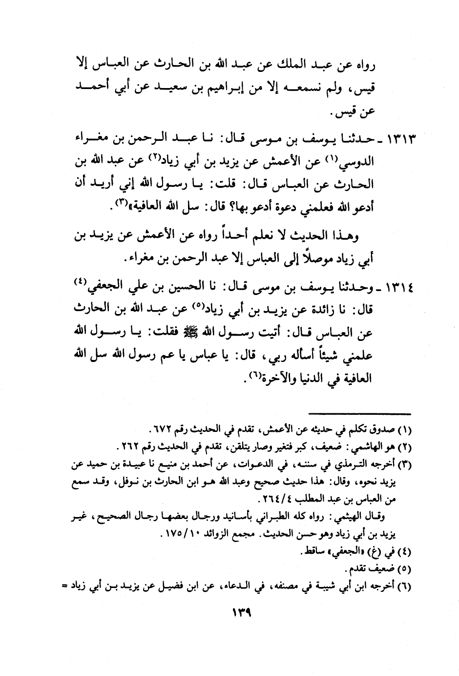 1313 - حَدَّثَنَا يُوسُفُ بْنُ مُوسَى، قَالَ: نا عَبْدُ الرَّحْمَنِ بْنُ مَغْرَاءَ الدَّوْسِيُّ، عَنِ الْأَعْمَشِ، عَنْ يَزِيدَ بْنِ أَبِي زِيَادٍ، عَنْ عَبْدِ اللَّهِ بْنِ الْحَارِثِ، عَنِ الْعَبَّاسِ، قَالَ: قُلْتُ يَا رَسُولَ اللَّهِ إِنِّي §أُرِيدُ أَنْ أَدْعُوَ اللَّهَ، فَعَلِّمْنِي دَعْوَةً أَدْعُو بِهَا، قَالَ: «سَلِ اللَّهَ الْعَافِيَةَ» وَهَذَا الْحَدِيثُ لَا نَعْلَمُ أَحَدًا رَوَاهُ، عَنِ الْأَعْمَشِ، عَنْ يَزِيدَ بْنِ أَبِي زِيَادٍ مُوَصَّلًا إِلَى الْعَبَّاسِ، إِلَّا عَبْدُ الرَّحْمَنِ بْنُ مَغْرَاءَ