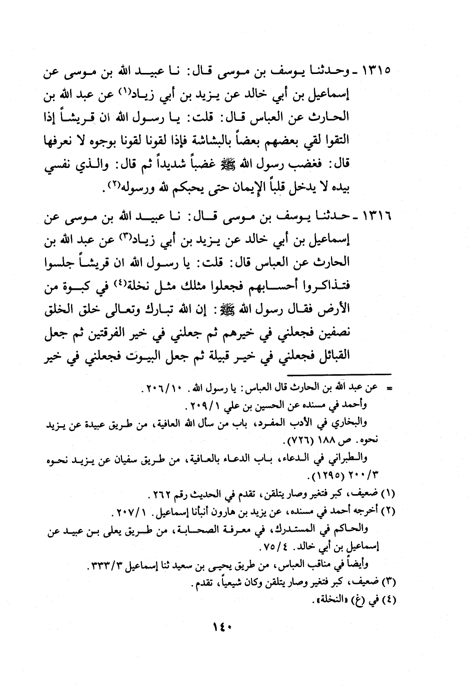 1315 - وَحَدَّثَنَا يُوسُفُ بْنُ مُوسَى، قَالَ: نا عُبَيْدُ اللَّهِ بْنُ مُوسَى، عَنْ إِسْمَاعِيلَ بْنِ أَبِي خَالِدٍ، عَنْ يَزِيدَ بْنِ أَبِي زِيَادٍ، عَنْ عَبْدِ اللَّهِ بْنِ الْحَارِثِ، عَنِ الْعَبَّاسِ، قَالَ: قُلْتُ يَا رَسُولَ اللَّهِ إِنَّ قُرَيْشًا إِذَا الْتَقَوْا لَقِيَ بَعْضُهُمْ بَعْضًا بِالْبَشَاشَةِ، فَإِذَا لَقُونَا لَقُونَا بِوُجُوهٍ لَا نَعْرِفُهَا، قَالَ: فَغَضِبَ رَسُولُ اللَّهِ صَلَّى اللهُ عَلَيْهِ وَسَلَّمَ غَضَبًا شَدِيدًا، ثُمَّ قَالَ: «وَالَّذِي نَفْسِي بِيَدِهِ §لَا يَدْخُلُ قَلْبًا الْإِيمَانُ حَتَّى يُحِبَّكُمْ لِلَّهِ وَرَسُولِهِ»