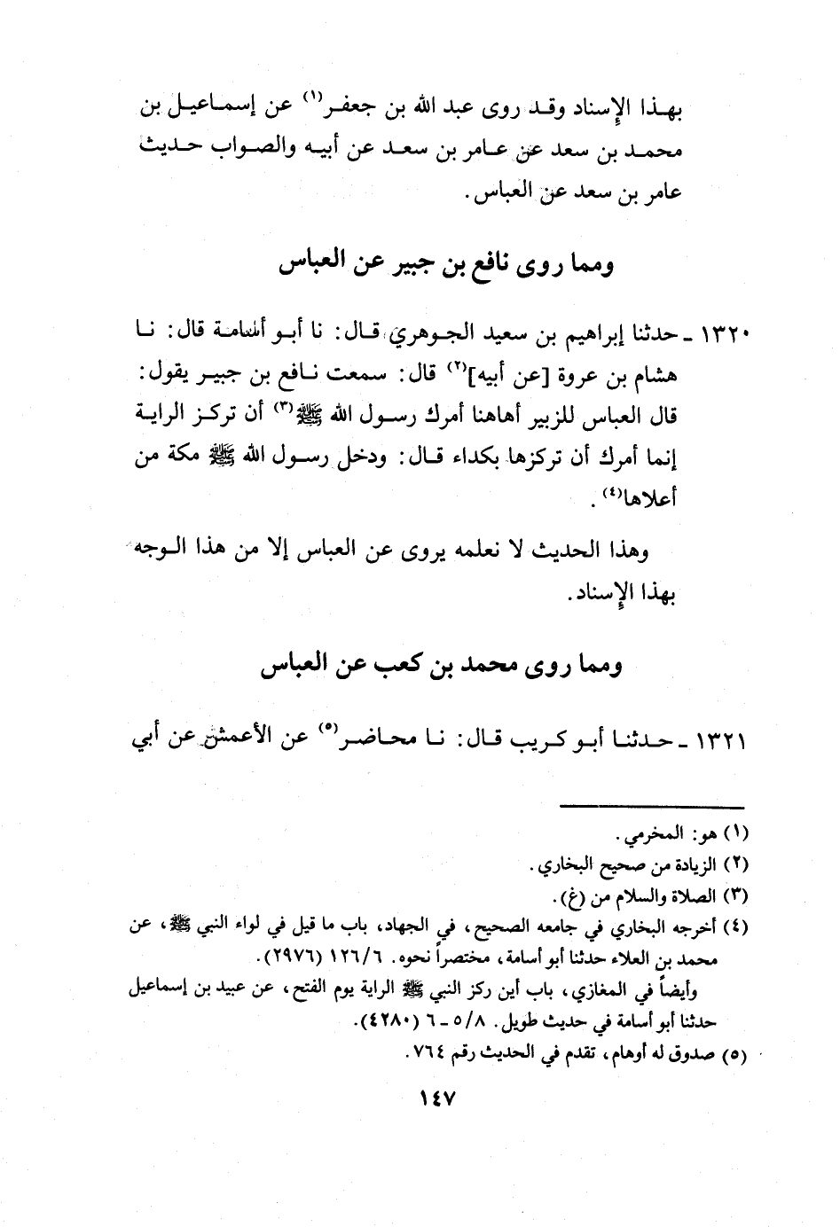 1320 - حَدَّثَنَا إِبْرَاهِيمُ بْنُ سَعِيدٍ الْجَوْهَرِيُّ، قَالَ: نا أَبُو أُسَامَةَ، قَالَ: نا هِشَامُ بْنُ عُرْوَةَ، عَنْ أَبِيهِ، قَالَ: سَمِعْتُ نَافِعَ بْنَ جُبَيْرٍ، يَقُولُ: قَالَ الْعَبَّاسُ لِلزُّبَيْرِ: " §أَهَاهُنا أَمَرَكَ رَسُولُ اللَّهِ صَلَّى اللهُ عَلَيْهِ وَسَلَّمَ أَنْ تَرْكُزَ الرَّايَةَ؟، إِنَّمَا أَمَرَكَ أَنْ تَرْكُزَهَا بِكَدَاءٍ، قَالَ: وَدَخَلَ رَسُولُ اللَّهِ صَلَّى اللهُ عَلَيْهِ وَسَلَّمَ مَكَّةَ مِنْ أَعْلَاهَا " وَهَذَا الْحَدِيثُ لَا نَعْلَمُهُ يُرْوَى عَنِ الْعَبَّاسِ إِلَّا مِنْ هَذَا الْوَجْهِ بِهَذَا الْإِسْنَادِ