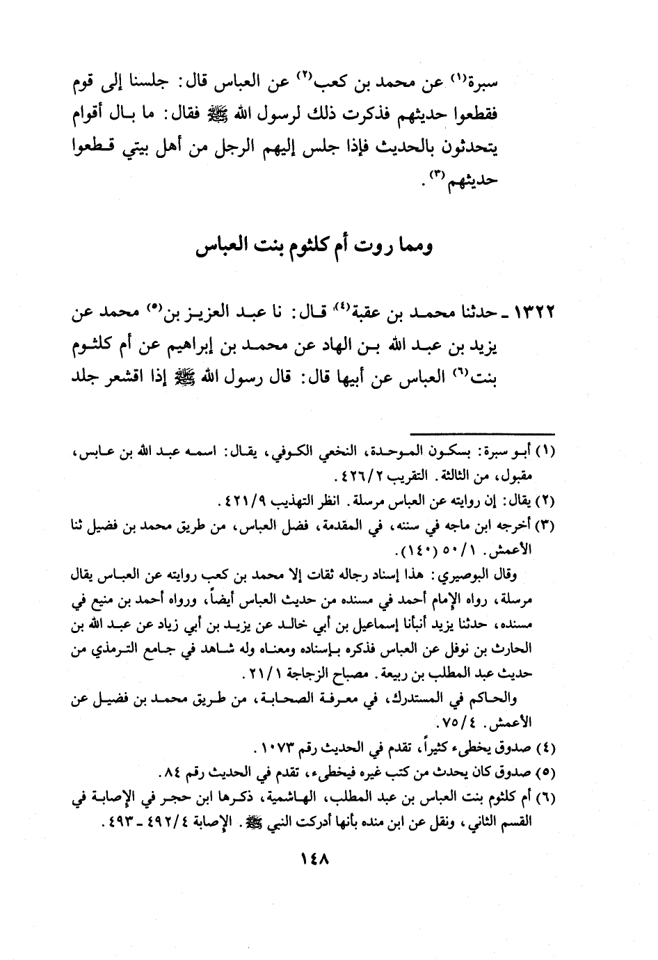 1322 - حَدَّثَنَا مُحَمَّدُ بْنُ عُقْبَةَ، قَالَ: نا عَبْدُ الْعَزِيزِ بْنُ مُحَمَّدٍ، عَنْ يَزِيدَ بْنِ عَبْدِ اللَّهِ بْنِ الْهَادِ، عَنْ مُحَمَّدِ بْنِ إِبْرَاهِيمَ، عَنْ أُمِّ كُلْثُومَ بِنْتِ الْعَبَّاسِ، عَنْ أَبِيهَا، قَالَ: قَالَ رَسُولُ اللَّهِ، صَلَّى اللهُ عَلَيْهِ وَسَلَّمَ: «§إِذَا اقْشَعَرَّ جِلْدُ -[149]- الْعَبْدِ مِنْ خَشْيَةِ اللَّهِ، تَحَاتَّتْ عَنْهُ خَطَايَاهُ كَمَا تَحَاتُّ عَنِ الشَّجَرَةِ الْبَالِيَةِ وَرَقُهَا» وَهَذَا الْكَلَامُ لَا نَحْفَظُهُ بِهَذَا اللَّفْظِ عَنْ رَسُولِ اللَّهِ صَلَّى اللهُ عَلَيْهِ وَسَلَّمَ إِلَّا عَنِ الْعَبَّاسِ عَنْهُ، وَلَا نَعْلَمُ لَهُ إِسْنَادًا عَنِ الْعَبَّاسِ إِلَّا هَذَا الْإِسْنَادَ