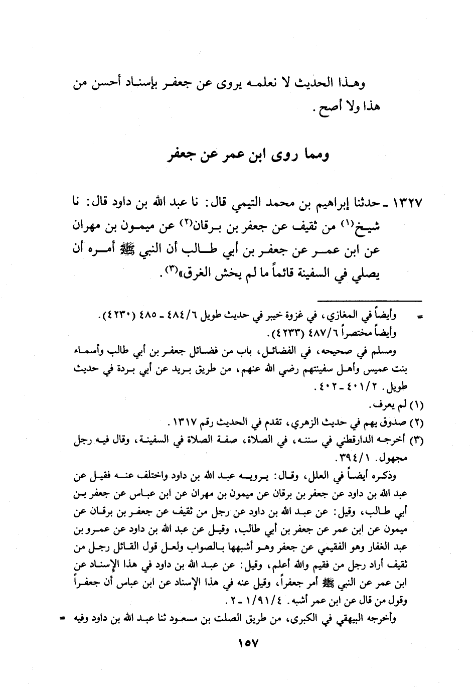 1327 - حَدَّثَنَا إِبْرَاهِيمُ بْنُ مُحَمَّدٍ التَّيْمِيُّ، قَالَ: نا عَبْدُ اللَّهِ بْنُ دَاوُدَ، قَالَ: نا شَيْخٌ، مِنْ ثَقِيفٍ، عَنْ جَعْفَرِ بْنِ بُرْقَانَ، عَنْ مَيْمُونِ بْنِ مِهْرَانَ، عَنِ ابْنِ عُمَرَ، عَنْ جَعْفَرِ بْنِ أَبِي طَالِبٍ: «أَنَّ §النَّبِيَّ صَلَّى اللهُ عَلَيْهِ وَسَلَّمَ أَمَرَهُ أَنْ يُصَلِّيَ فِي السَّفِينَةِ قَائِمًا مَا لَمْ يَخْشَ الْغَرَقَ» -[158]- وَهَذَا الْحَدِيثُ لَا نَعْلَمُهُ يُرْوَى، عَنْ جَعْفَرِ بْنِ أَبِي طَالِبٍ إِلَّا مِنْ هَذَا الْوَجْهِ بِهَذَا الْإِسْنَادِ، وَلَا نَعْلَمُ هَذَا الْكَلَامَ يُرْوَى عَنِ النَّبِيِّ صَلَّى اللهُ عَلَيْهِ وَسَلَّمَ مُتَّصِلًا مِنْ وَجْهٍ مِنَ الْوُجُوهِ إِلَّا مِنْ هَذَا الْوَجْهِ، وَلَا نَعْلَمُ لَهُ إِسْنَادًا إِلَّا هَذَا الْإِسْنَادَ، وَلَا نَعْلَمُ أَحَدًا سَمَّى الشَّيْخَ الَّذِي رَوَى عَنْهُ عَبْدُ اللَّهِ بْنُ دَاوُدَ وَرَأَيْتُ بَعْضَ أَصْحَابِنَا يَذْكُرُ هَذَا الْحَدِيثَ عَنْ عَمْرِو بْنِ عَبْدِ الْغَفَّارِ، عَنْ جَعْفَرِ بْنِ بُرْقَانَ، عَنْ مَيْمُونِ بْنِ مِهْرَانَ، عَنِ ابْنِ عَبَّاسٍ أَنَّ النَّبِيَّ صَلَّى اللهُ عَلَيْهِ وَسَلَّمَ قَالَ لِجَعْفَرٍ وَأَحْسَبُ أَنَّهُ غَلَطَ فِيهِ، وَإِنَّمَا هُوَ عِنْدِي عَنِ ابْنِ عُمَرَ كَمَا رَوَاهُ ابْنُ دَاوُدَ