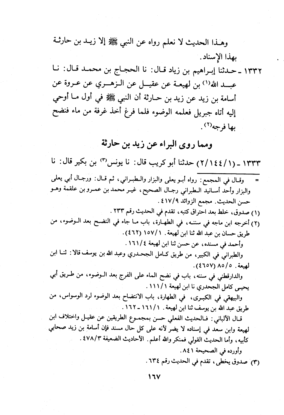 1332 - حَدَّثَنَا إِبْرَاهِيمُ بْنُ زِيَادٍ، قَالَ: نا الْحَجَّاجُ بْنُ مُحَمَّدٍ، قَالَ: نا عَبْدُ اللَّهِ بْنُ لَهِيعَةَ، عَنْ عُقَيْلٍ، عَنِ الزُّهْرِيِّ، عَنْ عُرْوَةَ، عَنْ أُسَامَةَ بْنِ زَيْدٍ، عَنْ زَيْدِ بْنِ حَارِثَةَ «أَنَّ §النَّبِيَّ صَلَّى اللهُ عَلَيْهِ وَسَلَّمَ فِي أَوَّلِ مَا أُوحِيَ إِلَيْهِ أَتَاهُ جِبْرِيلُ، فَعَلَّمَهُ الْوُضُوءِ، فَلَمَّا فَرَغَ أَخَذَ غُرْفَةً مِنْ مَاءٍ فَنَضَحَ بِهَا فَرْجَهُ»