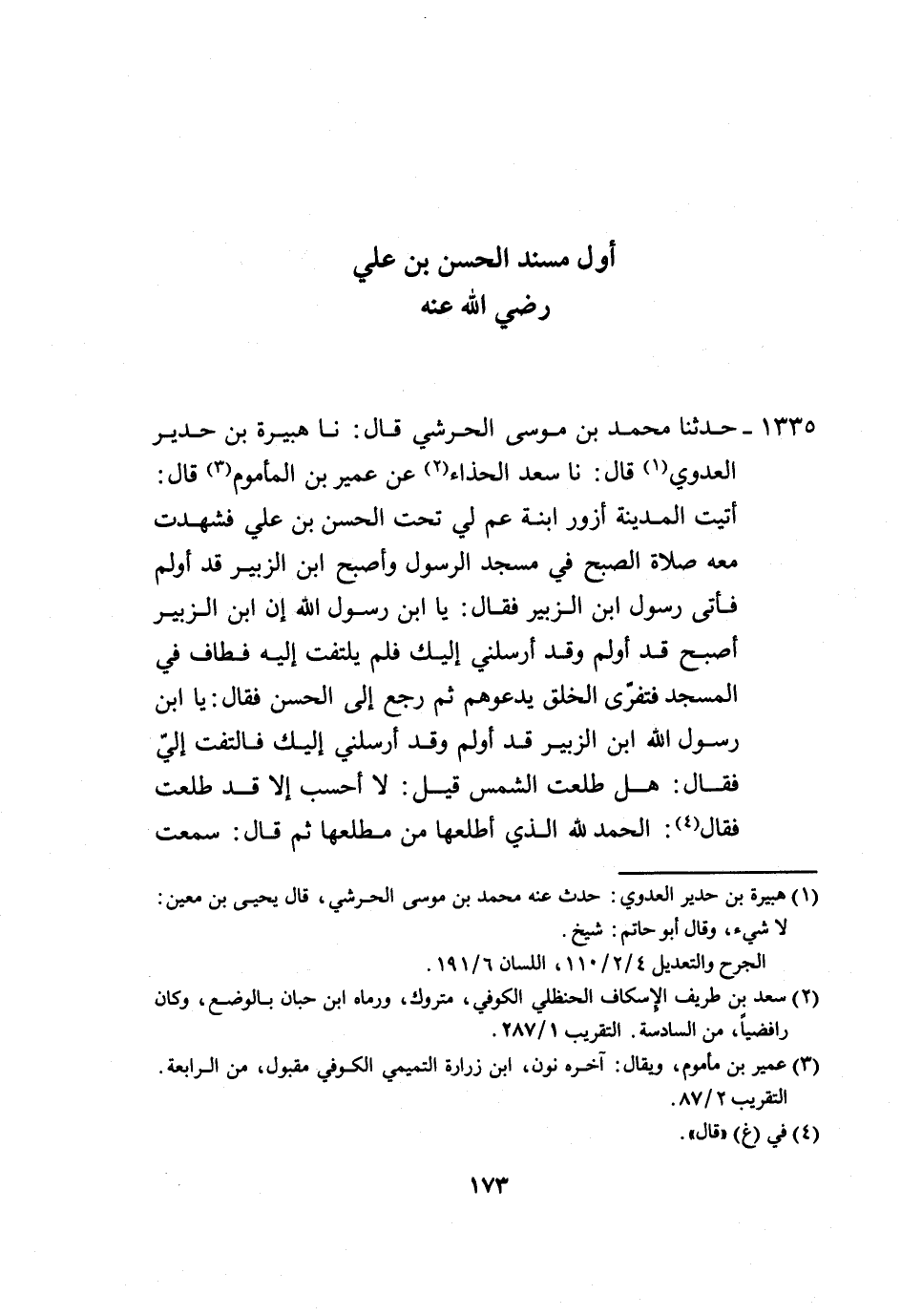 1335 - حَدَّثَنَا مُحَمَّدُ بْنُ مُوسَى الْحَرَشِيُّ، قَالَ: نا هُبَيْرَةُ بْنُ حُدَيْرٍ الْعَدَوِيُّ، قَالَ: نا سَعْدٌ الْحَذَّاءُ، عَنْ عُمَيْرِ بْنِ الْمَأْمُومِ، قَالَ: أَتَيْتُ الْمَدِينَةَ أَزُورُ ابْنَةَ عَمٍّ لِي تَحْتَ الْحَسَنِ بْنِ عَلِيٍّ، فَشَهِدْتُ مَعَهُ صَلَاةَ الصُّبْحِ فِي مَسْجِدِ الرَّسُولِ وَأَصْبَحَ ابْنُ الزُّبَيْرِ قَدْ أَوْلَمَ، فَأَتَى رَسُولُ ابْنِ الزُّبَيْرِ، فَقَالَ: يَا ابْنَ رَسُولِ اللَّهِ، إِنَّ ابْنَ الزُّبَيْرِ أَصْبَحَ قَدْ أَوْلَمَ، وَقَدْ أَرْسَلَنِي إِلَيْكَ، فَلَمْ يَلْتَفِتْ إِلَيْهِ، فَطَافَ فِي الْمَسْجِدِ فَتَفَرَّى الْخَلْقَ يَدْعُوهُمْ، ثُمَّ رَجَعَ إِلَى الْحَسَنِ، فَقَالَ: يَا ابْنَ رَسُولِ اللَّهِ، ابْنُ الزُّبَيْرِ قَدْ أَوْلَمَ، وَقَدْ أَرْسَلَنِي إِلَيْكَ، فَالْتَفَتَ إِلَيَّ، فَقَالَ: هَلْ طَلَعَتِ الشَّمْسُ، قِيلَ لَا أَحْسَبُ إِلَّا قَدْ طَلَعَتْ، فَقَالَ: الْحَمْدُ لِلَّهِ الَّذِي أَطْلَعَهَا مِنْ مَطْلَعِهَا، ثُمَّ قَالَ: سَمِعْتُ أَبِي وَجَدِّي، يَعْنِي النَّبِيَّ صَلَّى اللهُ عَلَيْهِ وَسَلَّمَ، وَأَصْبَحَ ابْنُ الزُّبَيْرِ قَدْ أَوْلَمَ، فَأَتَى رَسُولُ ابْنِ الزُّبَيْرِ، فَقَالَ: يَا ابْنَ رَسُولِ اللَّهِ، إِنَّ ابْنَ الزُّبَيْرِ أَصْبَحَ قَدْ أَوْلَمَ، وَقَدْ أَرْسَلَنِي إِلَيْكَ، فَلَمْ يَلْتَفِتْ إِلَيْهِ، فَطَافَ فِي الْمَسْجِدِ فَتَفَرَّى الْخَلْقَ يَدْعُوهُمْ، ثُمَّ رَجَعَ إِلَى الْحَسَنِ، فَقَالَ: يَا ابْنَ رَسُولِ اللَّهِ، ابْنُ الزُّبَيْرِ قَدْ أَوْلَمَ، وَقَدْ أَرْسَلَنِي إِلَيْكَ، فَالْتَفَتَ إِلَيَّ، فَقَالَ: هَلْ طَلَعَتِ الشَّمْسُ، قِيلَ لَا أَحْسَبُ إِلَّا قَدْ طَلَعَتْ، فَقَالَ: الْحَمْدُ لِلَّهِ الَّذِي أَطْلَعَهَا مِنْ مَطْلَعِهَا، ثُمَّ قَالَ: سَمِعْتُ أَبِي وَجَدِّي، يَعْنِي النَّبِيَّ صَلَّى اللهُ عَلَيْهِ وَسَلَّمَ، يَقُولُ: «§مَنْ صَلَّى الْغَدَاةَ ثُمَّ قَعَدَ يَذْكُرُ اللَّهَ حَتَّى تَطْلُعَ الشَّمْسُ، جَعَلَ اللَّهُ بَيْنَهُ وَبَيْنَ النَّارِ سِتْرًا» ، ثُمَّ قَالَ: قُومُوا فَأَجِيبُوا ابْنَ الزُّبَيْرِ، فَلَمَّا انْتَهَيْنَا إِلَى الْبَابِ تَلَقَّاهُ ابْنُ الزُّبَيْرِ عَلَى الْبَابِ، فَقَالَ: يَا ابْنَ رَسُولِ اللَّهِ أَبْطَأْتَ عَنِّي فِي هَذَا الْيَوْمِ، فَقَالَ: أَمَا إِنِّي قَدْ أَجَبْتُكُمْ إِنِّي صَائِمٌ، ثُمَّ قَالَ: فَهَا هُنَا تُحْفَةٌ، فَقَالَ الْحَسَنُ بْنُ عَلِيٍّ: سَمِعْتُ أَبِيَ وَجَدِّي، يَعْنِي النَّبِيَّ صَلَّى اللهُ عَلَيْهِ وَسَلَّمَ، يَقُولُ: «تُحْفَةُ الصَّائِمِ الزَّائِرِ أَنْ تُغَلَّفَ لِحْيَتُهُ وَتُجَمَّرَ ثِيَابُهُ وَتُذَرَّرَ، وَتُحْفَةُ الْمَرْأَةِ الصَّائِمَةِ الزَّائِرَةِ أَنْ تُمَشَّطَ رَأْسُهَا، وَتُجَمَّرَ ثِيَابُهَا وَتُذَرَّرَ» ، قَالَ: قُلْتُ يَا ابْنَ رَسُولِ اللَّهِ أَعِدْ عَلَيَّ الْحَدِيثَ، قَالَ: سَمِعْتُ أَبِيَ وَجَدِّي يَعْنِي النَّبِيَّ صَلَّى اللهُ عَلَيْهِ وَسَلَّمَ يَقُولُ: «مَنْ أَدَامَ الِاخْتِلَافَ إِلَى الْمَسْجِدِ أَصَابَ آيَةً مُحْكَمَةً، أَوْ رَحْمَةً مُنْتَظَرَةً، أَوْ عِلْمًا مُسْتَطْرَفًا، أَوْ كَلِمَةً تَزِيدُهُ هُدًى، أَوْ تَرُدُّهُ عَنْ رَدي، أَوْ يَدَعُ الذُّنُوبَ خَشْيَةً أَوْ حَيَاءً» وَهَذَا الْكَلَامُ لَا نَحْفَظُهُ عَنْ رَسُولِ اللَّهِ صَلَّى اللهُ عَلَيْهِ وَسَلَّمَ إِلَّا مِنْ هَذَا الْوَجْهِ، وَسَعْدٌ الْحَذَّاءُ هُوَ سَعْدُ بْنُ طَرِيفٍ، وَعُمَيْرُ بْنُ الْمَأْمُومِ لَا نَعْلَمُ رَوَى عَنْهُ إِلَّا سَعْدٌ