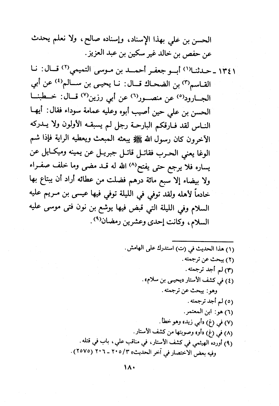 1341 - حَدَّثَنَا أَبُو جَعْفَرٍ أَحْمَدُ بْنُ مُوسَى التَّمِيمِيُّ، قَالَ: نا الْقَاسِمُ بْنُ الضَّحَّاكِ قَالَ: نا يَحْيَى بْنُ سَالِمٍ، عَنْ أَبِي الْجَارُودِ، عَنْ مَنْصُورٍ، عَنْ أَبِي رَزِينٍ، قَالَ: خَطَبَنَا الْحَسَنُ بْنُ عَلِيٍّ حِينَ أُصِيبَ أَبُوهُ، وَعَلَيْهِ عِمَامَةٌ سَوْدَاءُ، فَقَالَ: «أَيُّهَا النَّاسُ لَقَدْ §فَارَقَكُمُ الْبَارِحَةَ رَجُلٌ، لَمْ يَسْبِقْهُ الْأَوَّلُونَ وَلَا يُدْرِكُهُ الْآخِرُونَ، كَانَ رَسُولُ اللَّهِ صَلَّى اللهُ عَلَيْهِ وَسَلَّمَ يَبْعَثُهُ الْمَبْعَثَ، وَيُعْطِيهِ الرَّايَةَ، فَإِذَا شَمَّ الْوَغَا، يَعْنِي الْحَرْبَ، فَقَاتَلَ، قَاتَلَ جِبْرِيلُ عَنْ يَمِينِهِ وَمِيكَايِيلُ عَنْ يَسَارِهِ فَلَا يَرْجِعُ حَتَّى يَفْتَحَ اللَّهُ لَهُ، قَدْ مَضَى، وَمَا خَلَّفَ صَفْرَاءَ وَلَا بَيْضَاءَ إِلَّا سَبْعَ مِائَةِ دِرْهَمٍ فَضَلَتْ مِنْ عَطَائِهِ، أَرَادَ أَنْ يَبْتَاعَ بِهَا خَادِمًا لِأَهْلِهِ، وَلَقَدْ تُوُفِّيَ فِي اللَّيْلَةِ تُوُفِّيَ فِيهَا عِيسَى ابْنُ مَرْيَمَ عَلَيْهِ السَّلَامُ، وَفِي اللَّيْلَةِ الَّتِي قُبِضَ فِيهَا يُوشَعُ بْنُ نُونٍ فَتَى مُوسَى عَلَيْهِ السَّلَامُ، وَكَانَتْ إِحْدَى وَعِشْرِينَ رَمَضَانَ» -[181]- وَلَا نَعْلَمُ رَوَى أَبُو رَزِينٍ، عَنِ الْحَسَنِ بْنِ عَلِيٍّ إِلَّا هَذَا الْحَدِيثَ، حَدَّثَنَا مُحَمَّدُ بْنُ اللَّيْثِ الْهَدَادِيُّ، قَالَ: نا عُبَيْدُ اللَّهِ بْنُ مُوسَى بْنِ عُبَيْدَةَ، قَالَ: كَانَ بَيْنَ مُوسَى بْنِ عُبَيْدَةَ، وَبَيْنَ أَخِيهِ عَبْدِ اللَّهِ بْنِ عُبَيْدَةَ اثْنَتَانِ وَثَمَانُونَ سَنَةً، عَبْدُ اللَّهِ هُوَ الْأَكْبَرُ