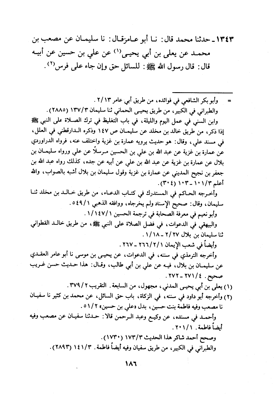 1343 - حَدَّثَنَا مُحَمَّدٌ، قَالَ: نا أَبُو عَامِرٍ، قَالَ: نا سُلَيْمَانُ، عَنْ مُصْعَبِ بْنِ مُحَمَّدٍ، عَنْ يَعْلَى بْنِ أَبِي يَحْيَى، عَنْ عَلِيِّ بْنِ حُسَيْنٍ، عَنْ أَبِيهِ، قَالَ: قَالَ رَسُولُ اللَّهِ صَلَّى اللهُ عَلَيْهِ وَسَلَّمَ: «§لِلسَّائِلِ حَقٌّ، وَإِنْ جَاءَ عَلَى فَرَسٍ»