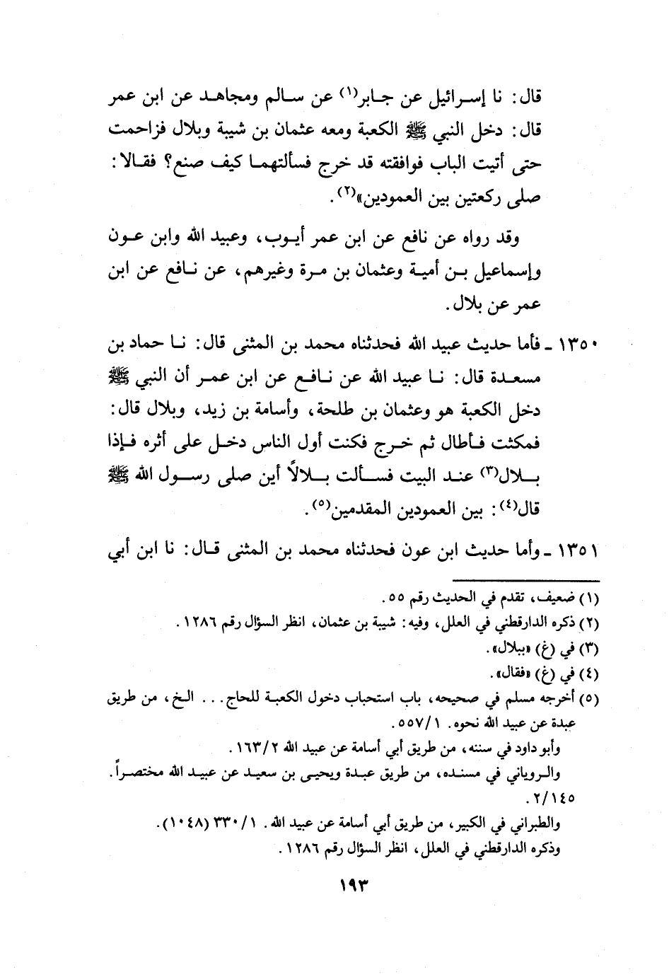 1350 - فَأَمَّا حَدِيثُ عُبَيْدِ اللَّهِ فَحَدَّثَنَاهُ مُحَمَّدُ بْنُ الْمُثَنَّى، قَالَ: نا حَمَّادُ بْنُ مَسْعَدَةَ، قَالَ: نا عُبَيْدُ اللَّهِ، عَنْ نَافِعٍ، عَنِ ابْنِ عُمَرَ: " أَنَّ النَّبِيَّ صَلَّى اللهُ عَلَيْهِ وَسَلَّمَ دَخَلَ الْكَعْبَةَ، هُوَ وَعُثْمَانُ بْنُ طَلْحَةَ وَأُسَامَةُ بْنُ زَيْدٍ وَبِلَالٌ، قَالَ: فَمَكَثْتُ، فَأَطَالَ، ثُمَّ خَرَجَ فَكُنْتُ أَوَّلَ النَّاسِ دَخَلَ عَلَى أَثَرِهِ، فَإِذَا بِلَالٌ عِنْدَ الْبَيْتِ، فَسَأَلْتُ بِلَالًا: §أَيْنَ صَلَّى رَسُولُ اللَّهِ، صَلَّى اللهُ عَلَيْهِ وَسَلَّمَ؟، قَالَ: بَيْنَ الْعَمُودَيْنِ الْمُقَدَّمَيْنِ "
