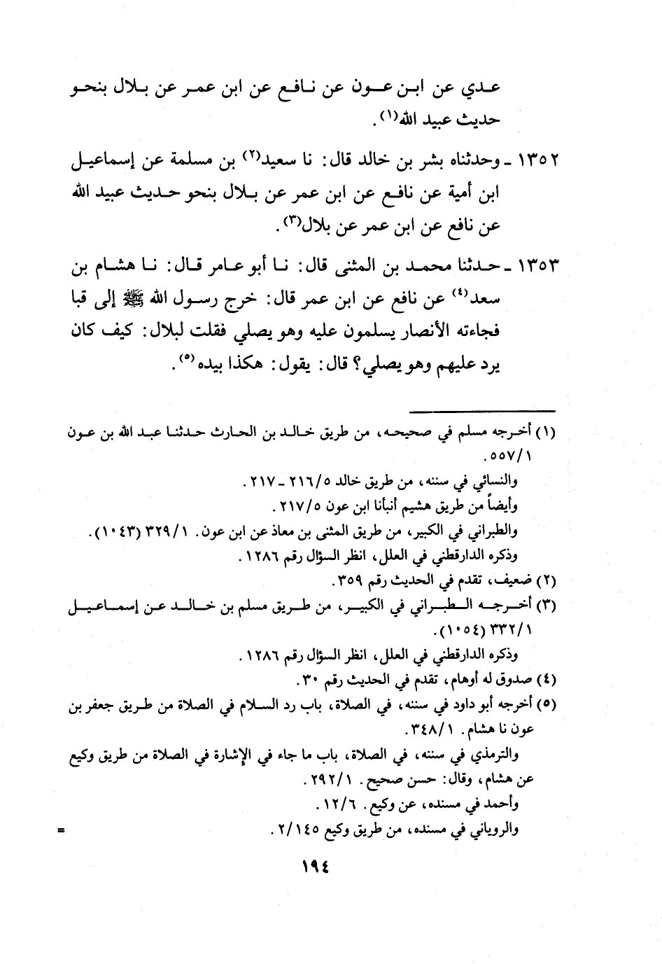 1353 - حَدَّثَنَا مُحَمَّدُ بْنُ الْمُثَنَّى، قَالَ: نا أَبُو عَامِرٍ، قَالَ: نا هِشَامُ بْنُ سَعْدٍ، عَنْ نَافِعٍ، عَنِ ابْنِ عُمَرَ، قَالَ: §خَرَجَ رَسُولُ اللَّهِ صَلَّى اللهُ عَلَيْهِ وَسَلَّمَ إِلَى قُبَاءَ، فَجَاءَتْهُ الْأَنْصَارُ يُسَلِّمُونَ عَلَيْهِ، وَهُوَ يُصَلِّي، فَقُلْتُ لِبِلَالٍ: كَيْفَ كَانَ يَرُدُّ عَلَيْهِمْ، وَهُوَ يُصَلِّي؟، قَالَ: يَقُولُ: هَكَذَا بِيَدِهِ -[195]-،